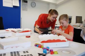 Wie werden eigentlich die schicken Parfumschachteln hergestellt? Wie entsteht eine Sixpack-Verpackung, wie eine Pizzaschachtel? Und wie gelingt es, Verpackungen sogar zum Leuchten zu bringen? Für den Aktionstag hat die Karl Knauer KG wieder ein starkes »Schnupperpaket« zusammengestellt. Nach einem Firmenrundgang erhielten die Teilnehmerinnen bei drei Projekt-Stationen spannende Einblicke. Da war zunächst das Farblabor, bei dem man beim Farbmischen seiner Kreativität Ausdruck verleihen konnte. Wer sich für Forschung und Entwicklung interessiert, dürfte bei der zweiten Station auf den Geschmack gekommen sein – hier fertigten die Besucherinnen eine Aufbewahrungsbox mit integriertem Spiel an. In der Elektrowerkstatt wurde in der dritten Station mit elektronischen Bauteilen das Spiel »Heißer Draht« montiert.