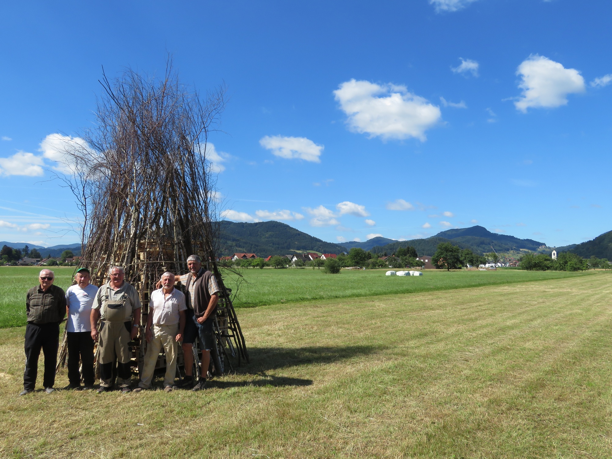 Bestückt wurden die Zwischenräume der Holzpaletten mit Buchen- und Eichenrollen, um den Paletten den nötigen Halt zu geben. Zum Abschluss der Arbeiten wurde die ganze Konstruktion noch mit vier Meter langen Birkenholzstangen rundum verkleidet. Nach zweistündiger Arbeit war die Johannispyramide fertig.