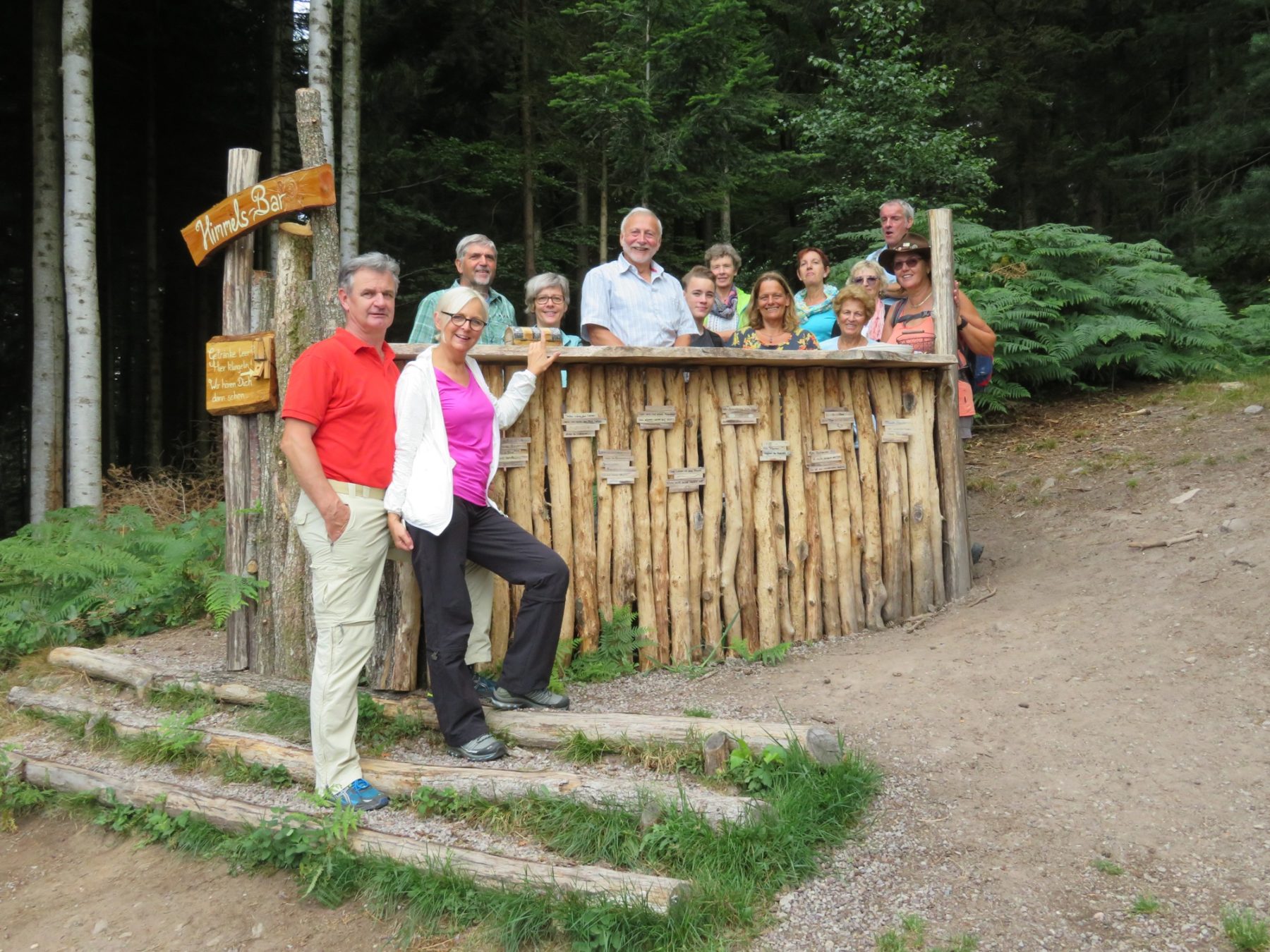 13 Wanderfreunde trafen sich am Sonntag, um mit der OSB nach Bad Peterstal zu fahren. Durch Bad Peterstal wanderte die Gruppe vorbei an der Kirche zum ersten Aufstieg auf dem Himmelssteig hoch zur Himmelsbar. Hier gab es gekühlte Getränke und manche Weisheiten waren an der Bartheke zu lesen. Zum Beispiel: »Der Wald ist das Krankenhaus unserer Seele«, »Mach heute so wunderbar, dass gestern neidisch wird« oder »Geh mal zur Seite Kaffee, das ist ein Job für Alkohol« und viele andere Sprüche. Nach kurzer Rast ging es weiter und weiter über Überskopf und Milbensattel, vorbei am Haberer Turm zur Mattenschanze in Bad Griesbach. Hier fand das Sommerskispringen 2018 um dem Georg-Thoma-Pokal statt. Die jüngsten Springer waren gerade einmal 10 Jahre alt. Der weiteste Sprung den die Biberacher sehen durften war 60,5 Meter. Der Schanzenrekord liegt bei 64 Meter.