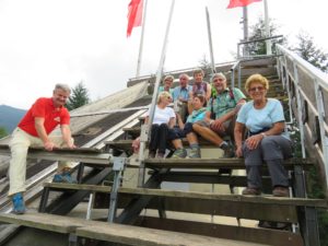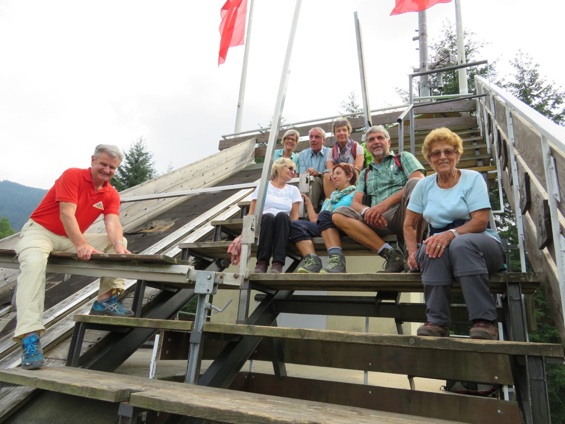 Nach so viel Sport durfte dann die Sprungschanze aus der Nähe betrachtet werden. Jeder der wollte, konnte sich auf den Absprungbalken setzen und sich in die Situation der Skispringer versetzen. Die fachkundige Führung auf der Schanze übernahmen Hansi Tressl und Sylvia Schröter, die auch die schöne und aussichtsreiche Wanderung geführt haben. Beide sind Mitglieder der Skizunft Bad Griesbach. Nach dem Essen auf dem Festgelände der Skizunft fuhr die Gruppe mit der Bahn zurück nach Biberach.