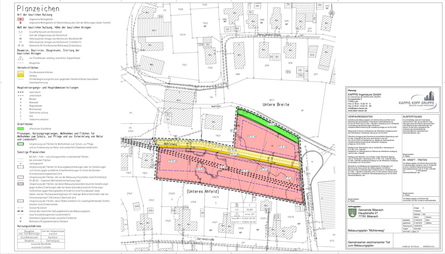 Für die Aufstellung des Bebauungsplans mussten eine ganze Reihe von Fachgutachten eingeholt werden. Ein Teil des Gebietes liegt im Bereich eines hundertjährigen Hochwassers. Der relativ hohe Grundwasserstand erfordert eine Sockelhöhe von 0,80 bis 1,00 Meter und die Ausbildung einer weißen Wanne. Wie in weiten Teilen von Biberach besteht auch hier eine erhöhte Schwermetallbelastung. Außerdem bestehen Verdachtspunkte, dass sich auf dem Gelände noch Bombenblindgänger befinden. Aufgrund des Gewerbegebiets und der Schwarzwaldbahn müssen im nordöstlichen Plangebiet passive Schallschutzmaßnahmen umgesetzt werden. Die Entwässerung der Straße kann über den Mühlenkanal erfolgen. Die künftigen Bauherren müssen das Oberflächenwasser direkt auf ihren Grundstücken versickern.