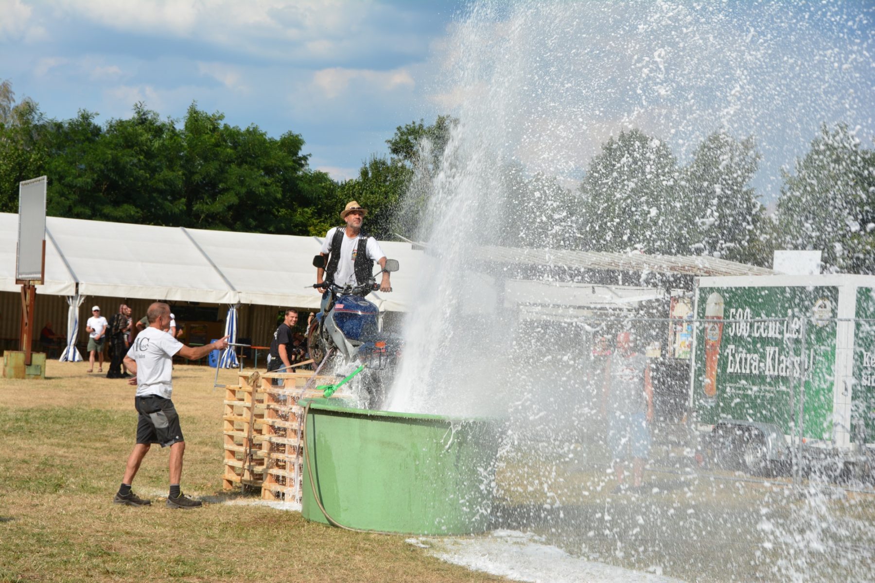 »Wir sind mit dem Verlauf sehr zufrieden«, zieht Vereinsvorsitzender Bernd Schrempp eine positive Bilanz. 140 Helfer waren im Einsatz, um das zweitägige Fest zu stemmen. Die Arbeit beginnt schon am Montag vor dem Motorradtreffen mit dem Aufbau des Festplatzes. Eine Woche später ist von dem Spektakel nichts mehr zu sehen. »Alles läuft professionell ab«, stellt Schrempp fest und ist dankbar für die Unterstützung durch die Feuerwehr und das THW. Erstere übernehmen den Parkplatzdienst, das THW stellt ihr großes Scheinwerferaggregat zur Verfügung. Seit einigen Jahren werden auch sanitäre Anlagen und Duschmöglichkeiten für die Gäste aufgebaut.