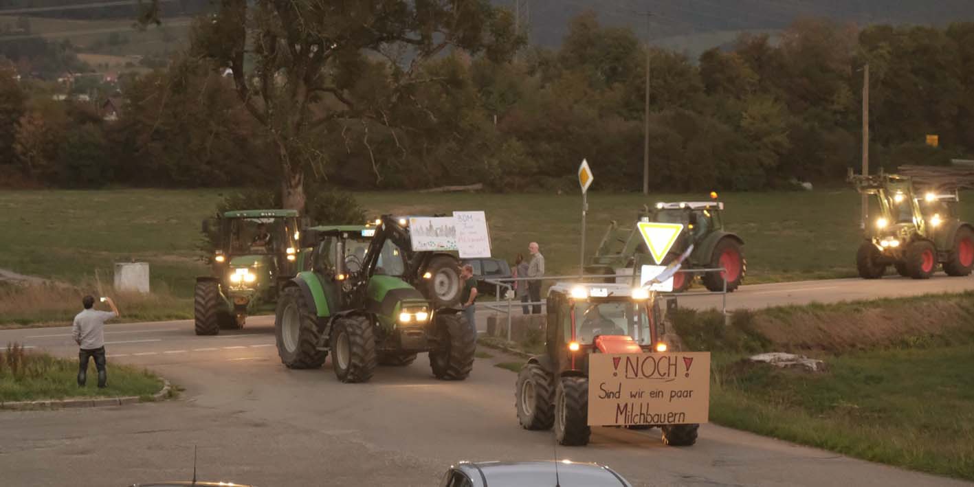 Mit reichlich Verspätung – L94-Baustelle und Bahnschranken sorgten für Verzögerungen im Ablauf – kamen etwa 15 Trecker und der Tour-Bus des Bundesverbandes der Deutschen Milchviehhalter (BDM) vor dem Gasthaus »Linde« in Biberach im wahrsten Sinne des Wortes angetuckert. Mit ihrer Fahrt im Traktoren- Konvoi von Lautenbach durch das Renchtal über den Löcherberg nach Biberach wollten die Milchviehhalter auf ihre Situation aufmerksam machen.