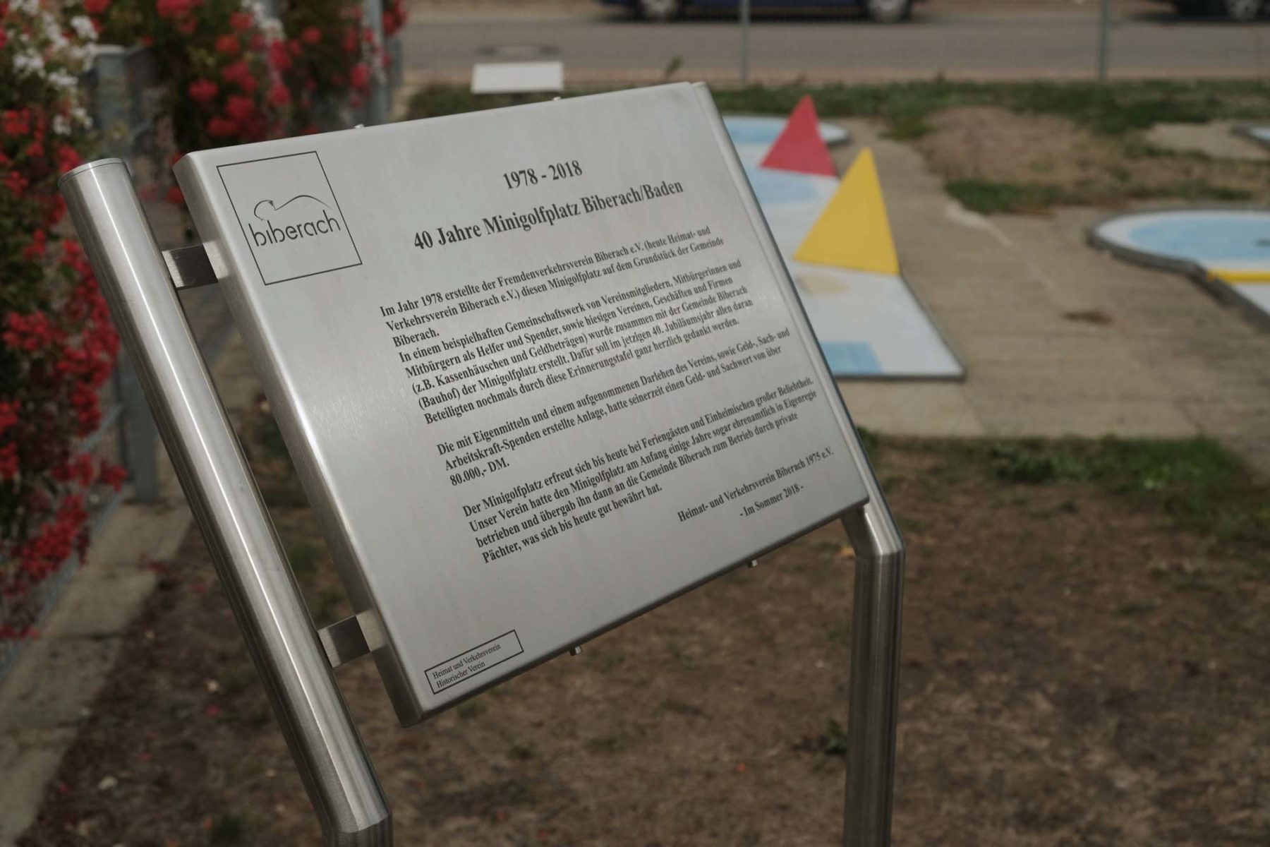 Seit 40 Jahren wird in Biberach Minigolf gespielt. Zum Jubiläum der Bahn übergab der Heimat- und Verkehrsverein nun eine Erinnerungstafel.