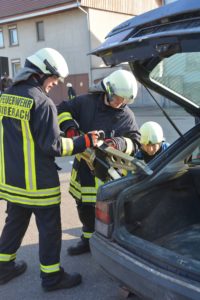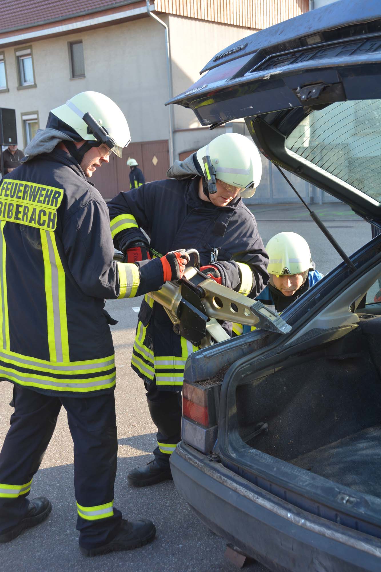 Ein Verkehrsunfall mitten im Ort beim Autohaus Holzenthaler stand im Mittelpunkt der Herbstübung der Freiwilligen Feuerwehr und des DRK-Ortsvereins Biberach. Zahlreiche Zuschauer konnten dabei miterleben, wie eine eingeklemmte Person aus einem Auto befreit wird.
