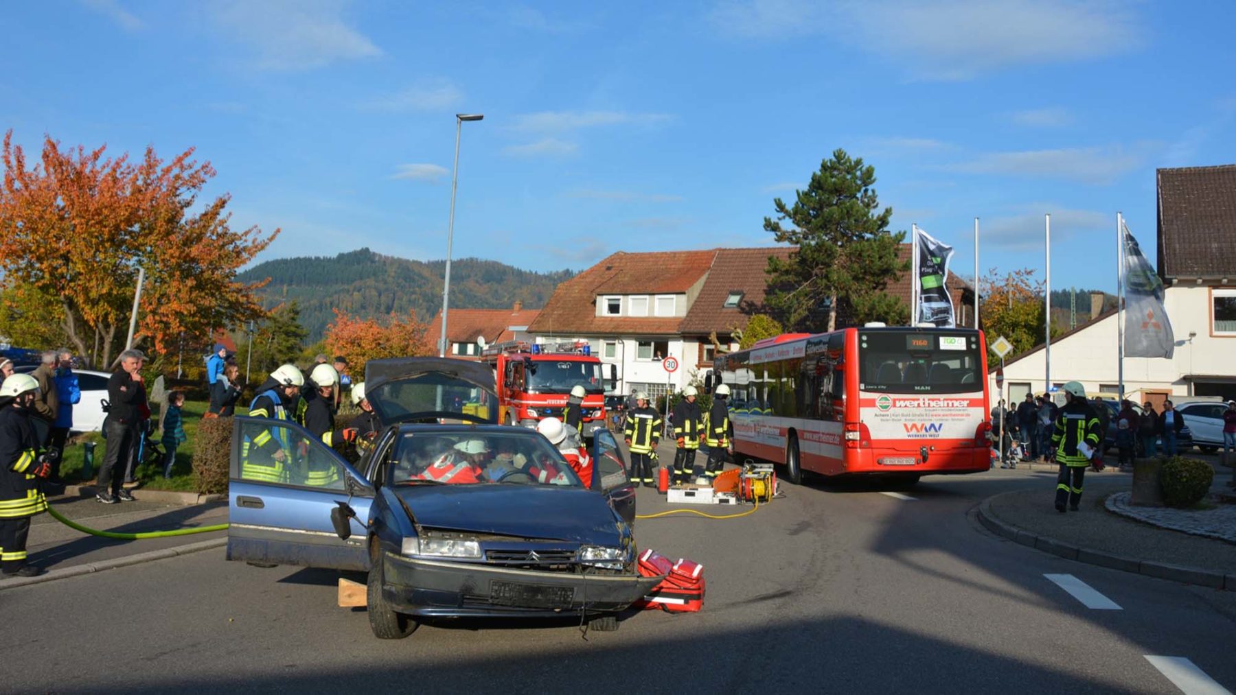 Ein angenommener Verkehrsunfall stand im Mittelpunkt der Herbstübung, die von der Freiwilligen Feuerwehr gemeinsam mit dem DRK-Ortsverein durchgeführt wurde. Zu einem »Zwischenfall« kam es, als der reguläre Linienbus sich durch die Unfallstelle zwängen musste.