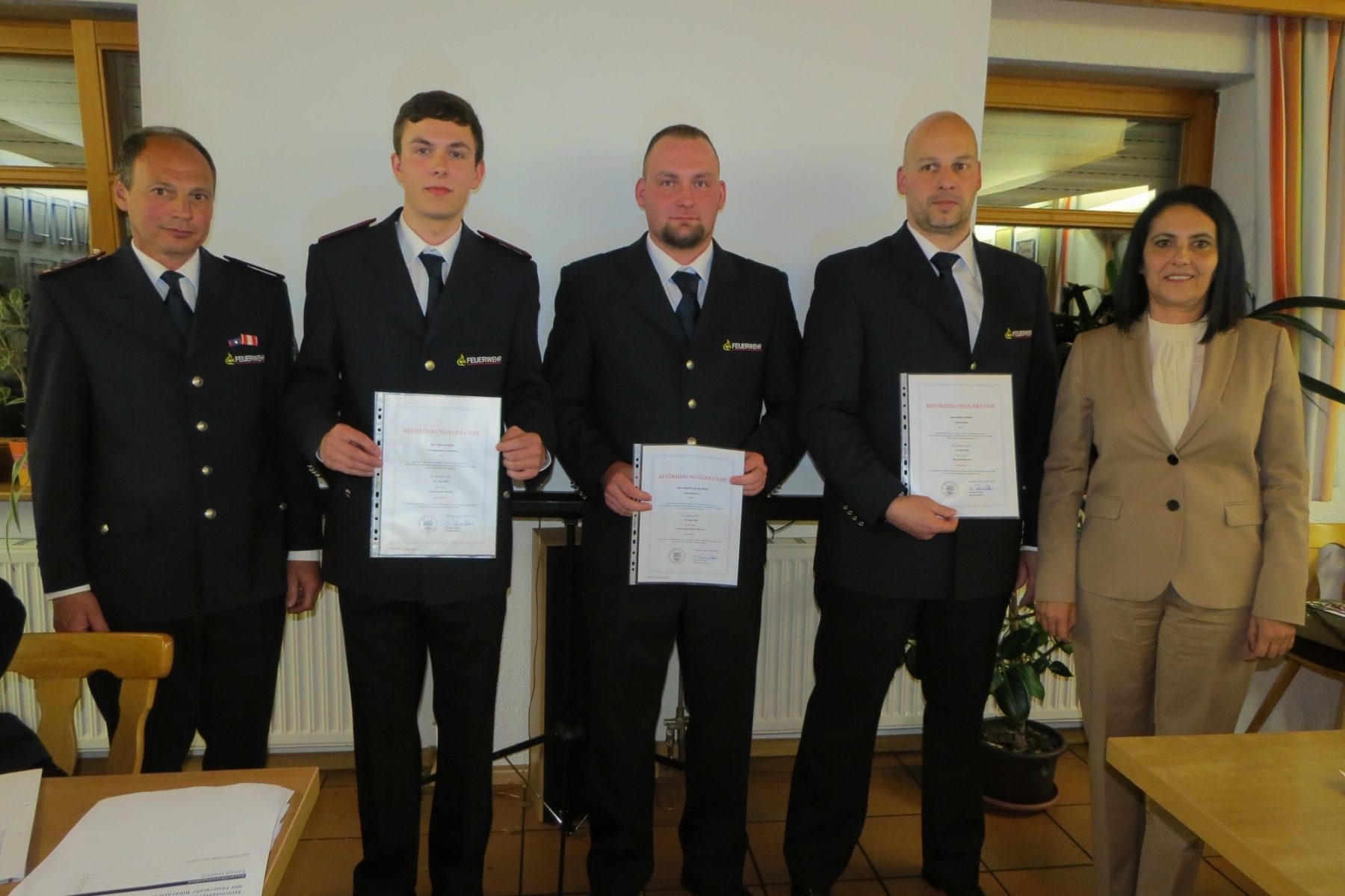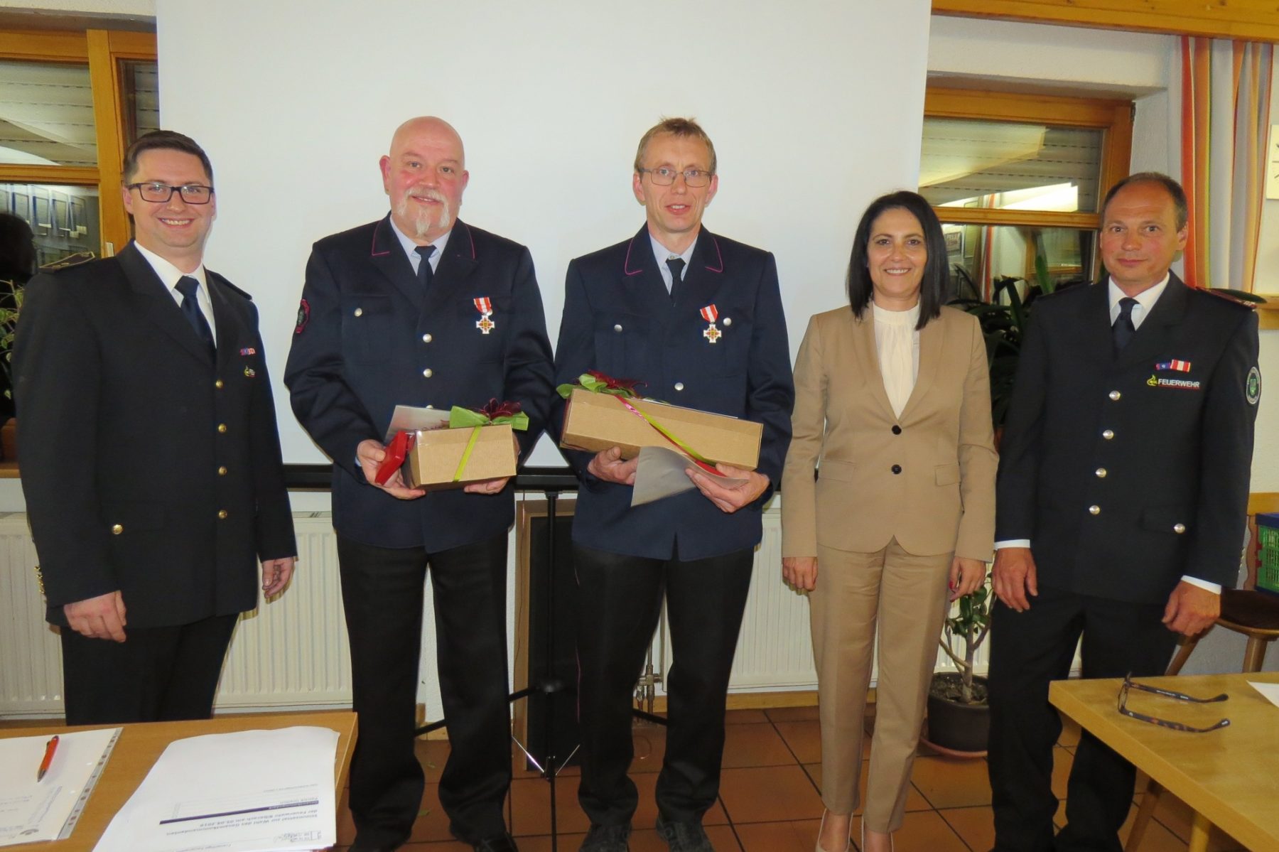 Der Abteilungskommandant der Prinzbacher Feuerwehr, Pirmin Huber, dankte den beiden scheidenden Kommandanten mit einem Fotorückblick auf besondere Ereignisse und zwei großen Präsentkörben. Bürgermeisterin Daniela Paletta hielt ebenfalls eine Dankesrede zur Verabschiedung von Klaus Disch und Clemens Wussler: »Sie haben viel dafür getan, das Leben und den Besitz der Biberacher Bürger zu schützen. Sie waren tatkräftig und umsichtig in ihrer Leitung.« Ihnen gebühre Respekt, gefährliche Rettungseinsätze in der Feuerwehrarbeit mit dem Einsatz der eigenen Gesundheit geleistet und dabei viel Freizeit geopfert zu haben. Klaus Disch habe 14 Jahre lang mit der Leitung der Feuerwehr eine besondere Verantwortung getragen; insgesamt ist er seit 32 Jahren Mitglied. Bürgermeisterin Daniela Paletta überreichte den Feuerwehrmännern Präsente mit der Zusage, sie in einem anderen Rahmen von der Gemeinde offiziell zu verabschieden.