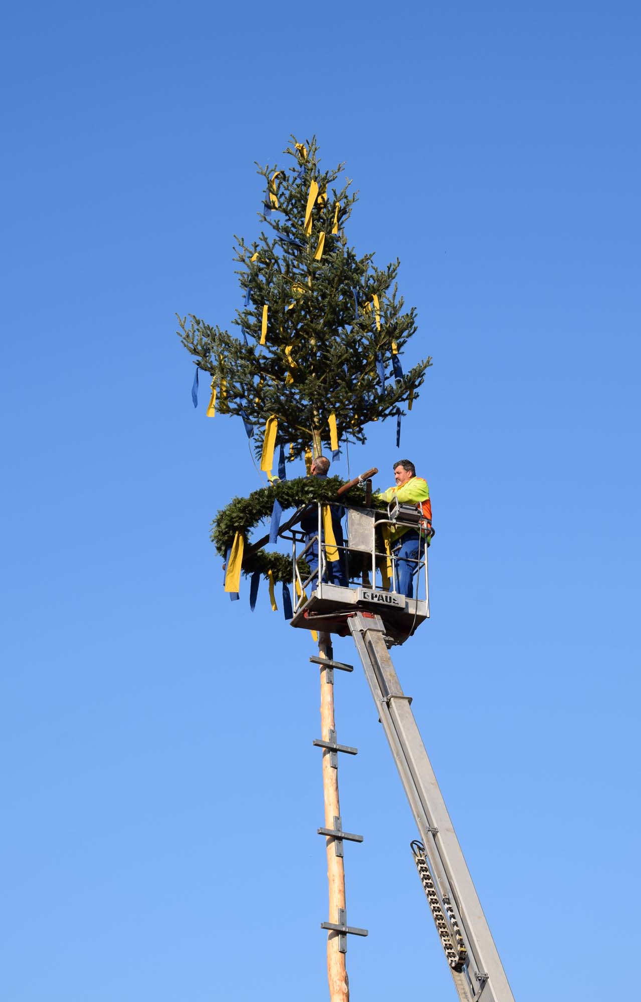 Foto: Daniel SpitzBei strahlendem Sonnenschein konnte Bürgermeisterin Daniela Paletta zahlreiche Gäste begrüßen. Perfekte Bedingungen also für das Aufstellen des Baumes. Wie Recherchen von Gerhard Matt und Wilhelm Schmieder ergaben, wurde der erste Maibaum in Biberach bereits 1966 gestellt, informierte das Gemeindeoberhaupt. Seit 1984 wird der Baum, der in diesem Jahr aus dem Wald hinter dem Schwimmbad stammt, gemeinsam vom Bauhof und dem FV Biberach mit reiner Muskelkraft unter Zurhilfenahme von langen Stangen aufgerichtet. In diesem Jahr war die logistische Meisterleistung unter der Regie von Bauhofmitarbeiter Josef Schmidt in rund 20 Minuten vollendet.