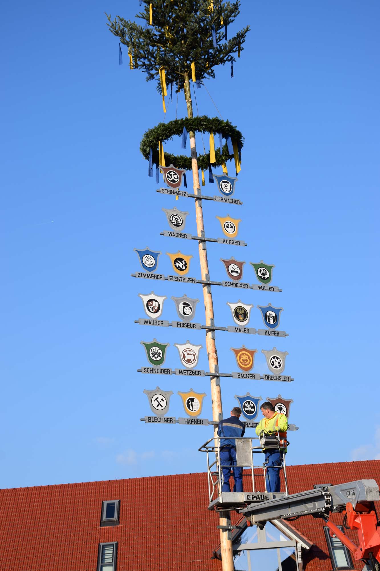 Der prächtige Kranz, welcher den Maien ziert, wurde zuvor von den FVB-Frauen gebunden und am Aufstellort mit bunten Bändern in den Vereinsfarben Blau und Gelb des Fußballvereins geschmückt. Seit dem Jahr 2004 verschönern zudem die von Handwerksmeister Siegfried Schilli gefertigten Handwerkertafeln den Baum.