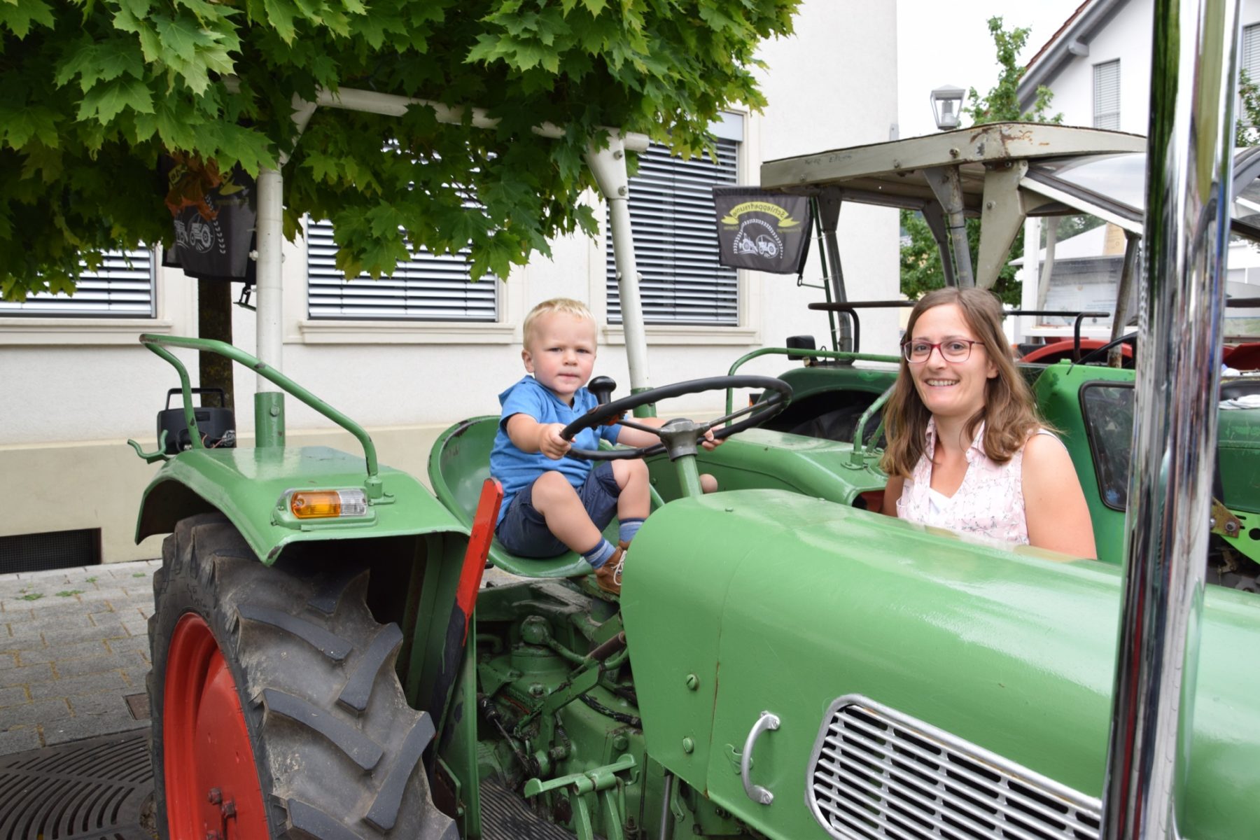 Ganz hoch im Kurs stehen die betagten Bulldogs bei den Jüngsten Besuchern: Ben Lehmann (21 Monate) posiert stolz hinter dem Lenkrad. Mutter Theresia Lehmann passt auf, dass er nicht losbraust.