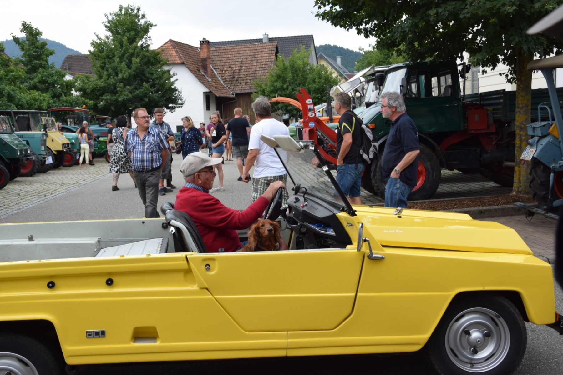 Doch nicht nur große und kleine Schlepper sowie Unimogs gab es zu bestaunen. So hat zum Beispiel Otmar Schmidt aus Bombach verschiedene historische Arbeitsgeräte von der Hochdruckspritze über diverse Balkenmäher bis zum Kultivator aus dem Rebanbau ausgestellt. Besondere Aufmerksamkeit erzeugte auch Hans Göhring, der mit­samt Dackel in seinem zitronengelben Renault Rodeo Freizeitwagen den Weg von Zell nach Biberach gefunden hat.