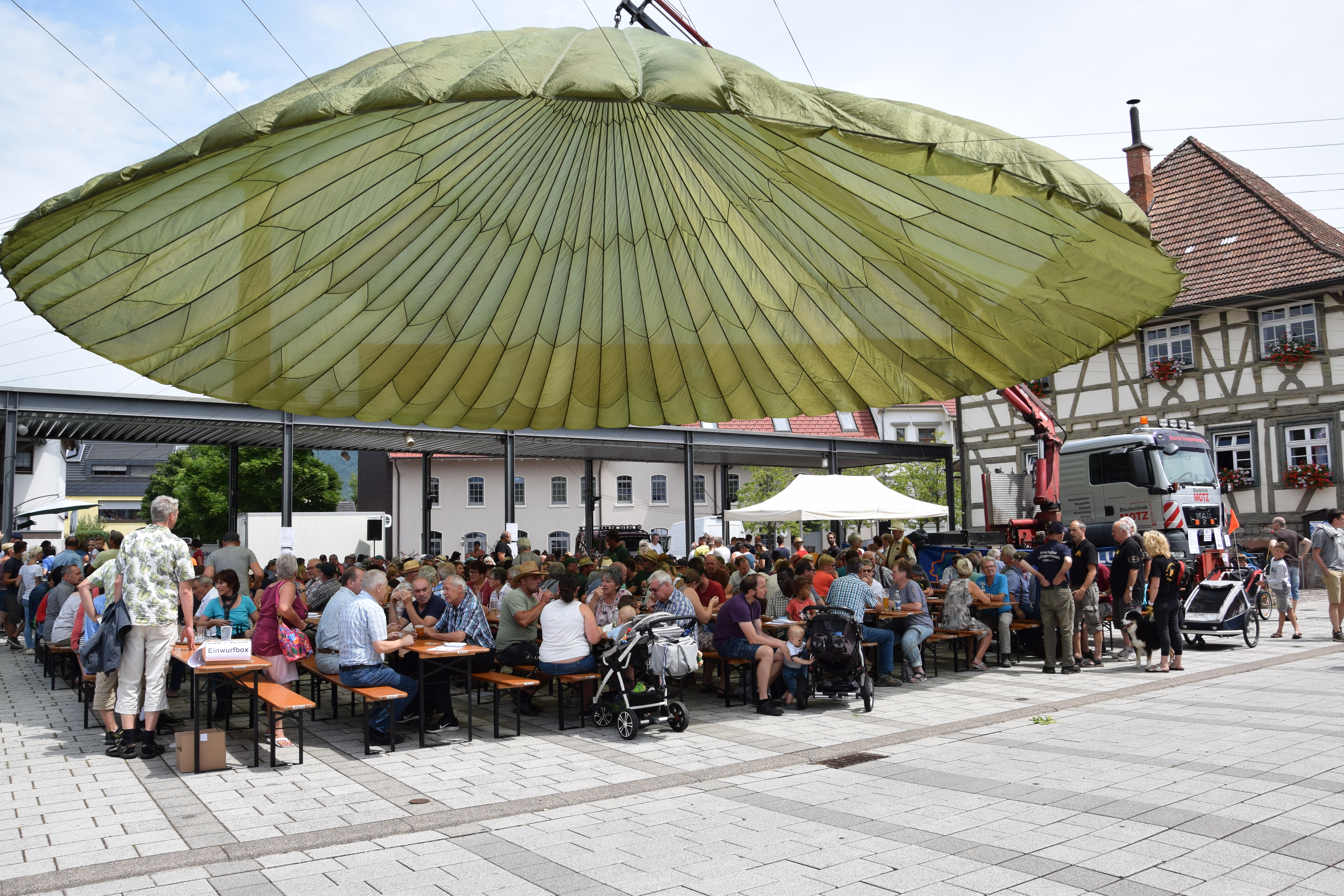 Imposanter Anblick und einfallsreiche Idee: Ein großer Lastenfallschirm spendete den rund 600 Besuchern auf dem gesamten Festplatz Schatten. Foto: Daniel Spitz