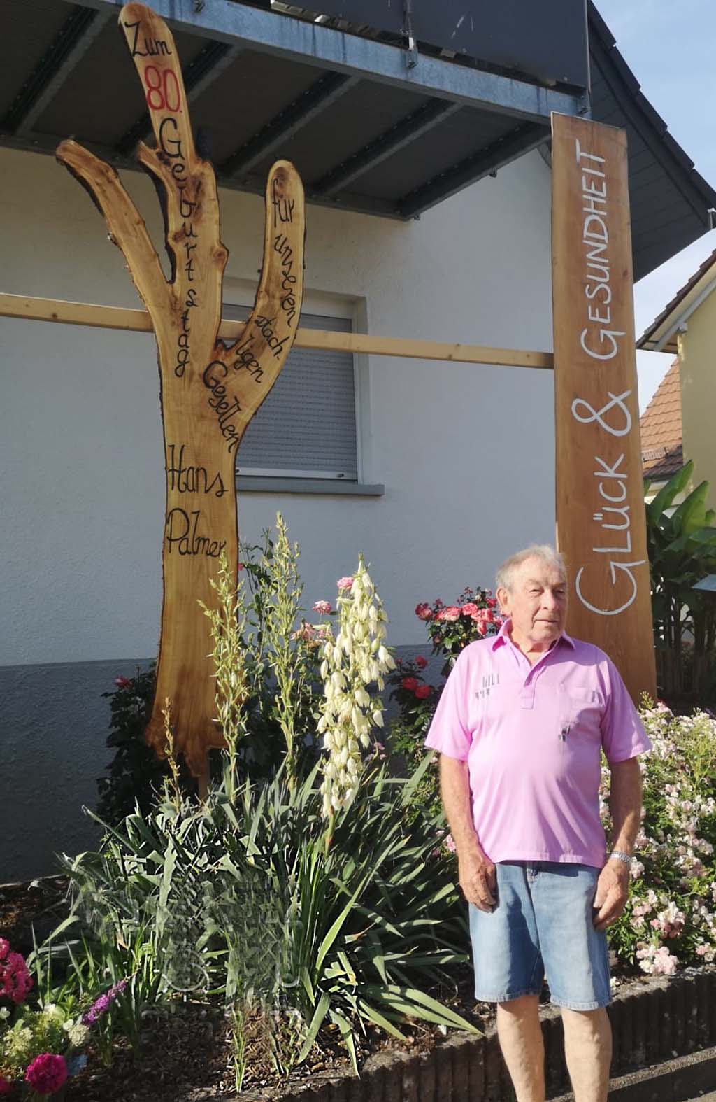 Die Nachbarn, die »Hansjakobsträßler Bibere« stellten einen ungewöhnlichen Maien – in Kakteenform und wünschten mit diesem Glück und Gesundheit. Die Form bezog sich ganz offensichtlich auf Hans Palmers liebstes Hobby, das Kakteensammeln und -züchten. Nicht nur die Nachbarn bewundern die exotische Pracht. Besucher aus der ganzen Welt kommen nach Biberach, um sie zu bestaunen. Mehr als 40 Jahre – also sein halbes Leben – hat Hans Palmer schon sein Herz an die stacheligen Gesellen verloren. Auch ein passgenau gereimtes Mundart-Geburtstagsgedicht hatten die Gratulanten dabei, bei dem seine zahlreichen weiteren Leidenschaften thematisiert wurden.