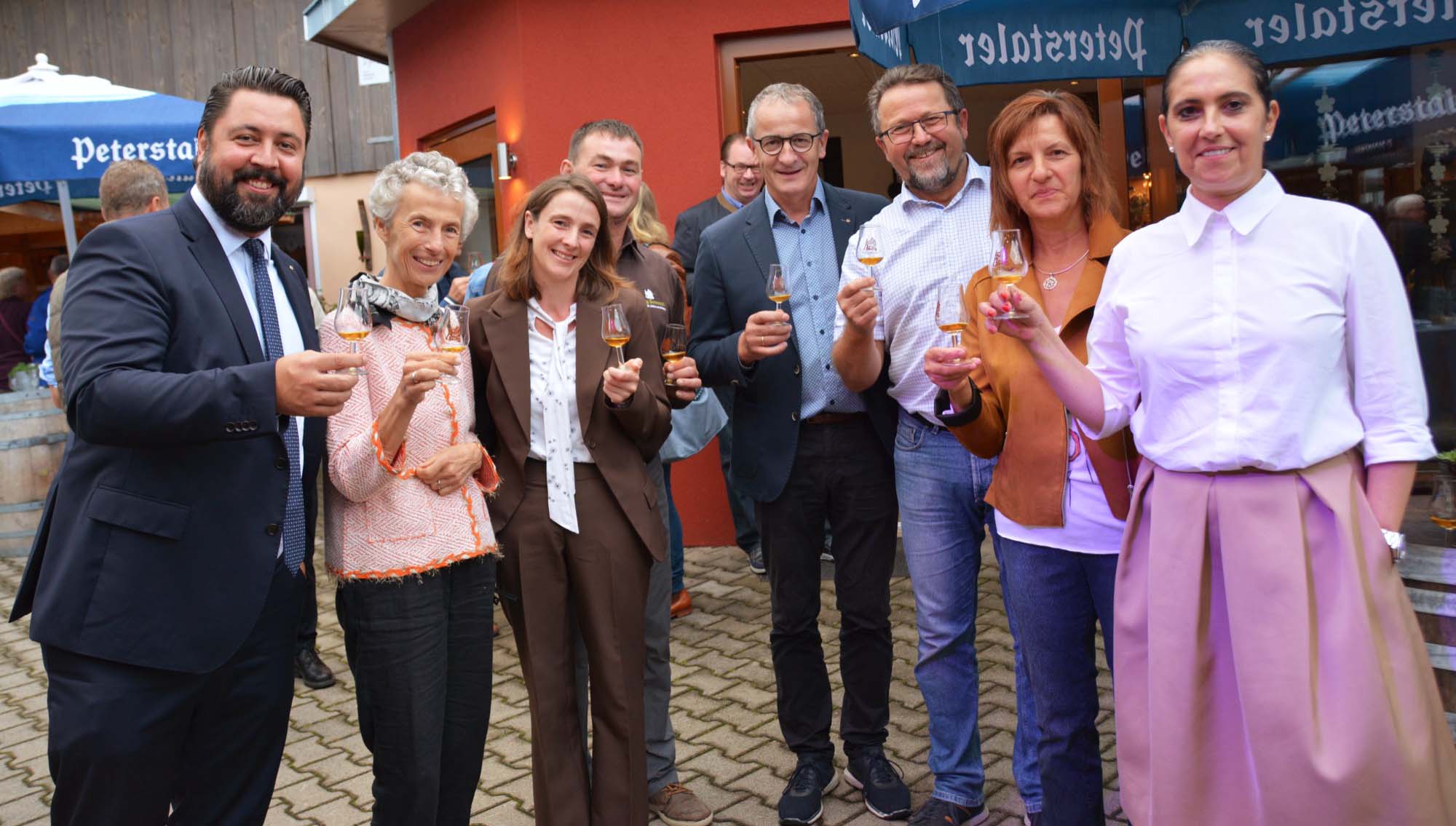 Zahlreiche Ehrengäste feierten gemeinsam mit der Familie Brosamer den 15. Geburtstag der Whisky-Destillerie (von links): Bürgermeister Philipp Saar, stellv. Landwirtschaftsamt-Leiterin Andrea Ganter, Tanja und Martin Brosamer, Kleinbrennerverbands-Vorsitzender Ulrich Müller, Bildungsreferent Helmut Lehmann, Landfrauen-Vorsitzende Rosa Karcher und Bürgermeisterin Daniela Paletta. Foto: Hanspeter Schwendemann
