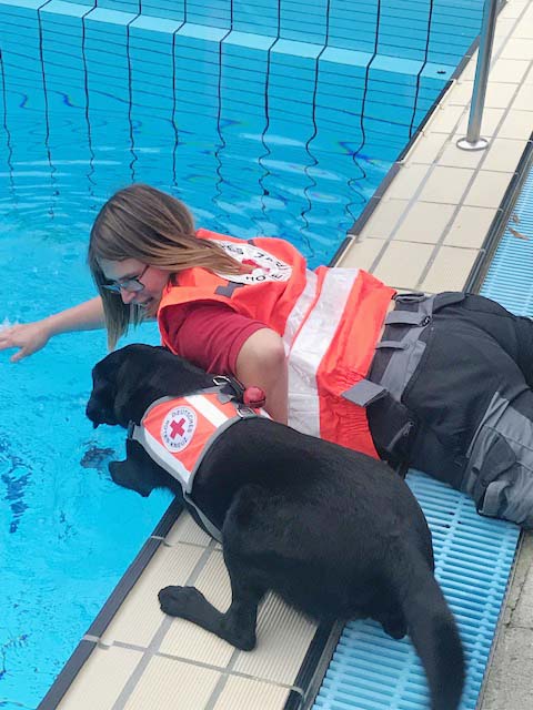 Zehn ehrenamtliche Rettungshundeführer des Offenburger Roten Kreuzes haben sich mit den eigentlichen Stars der Show, den Hunden, im Waldterrassenbad in Biberach am Mittwoch eingefunden, um zu üben – in voller DRK-Montur, einschließlich Signalweste.