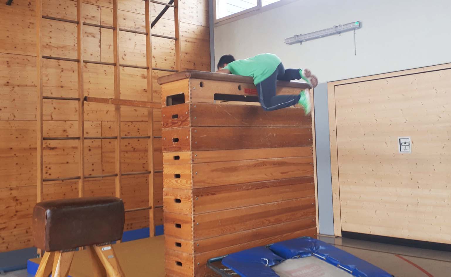 Natürlich wurde die für den Parcours benötigte Zeit gemessen. Und diese wurde erst angehalten, nachdem die Kinder am Ende einen kräftigen Sprung auf dem Trampolin gemacht hatten, um hoch auf den Kasten zu kommen. Dort mussten sie selbst die Glocke an der Kletterwand läuten.