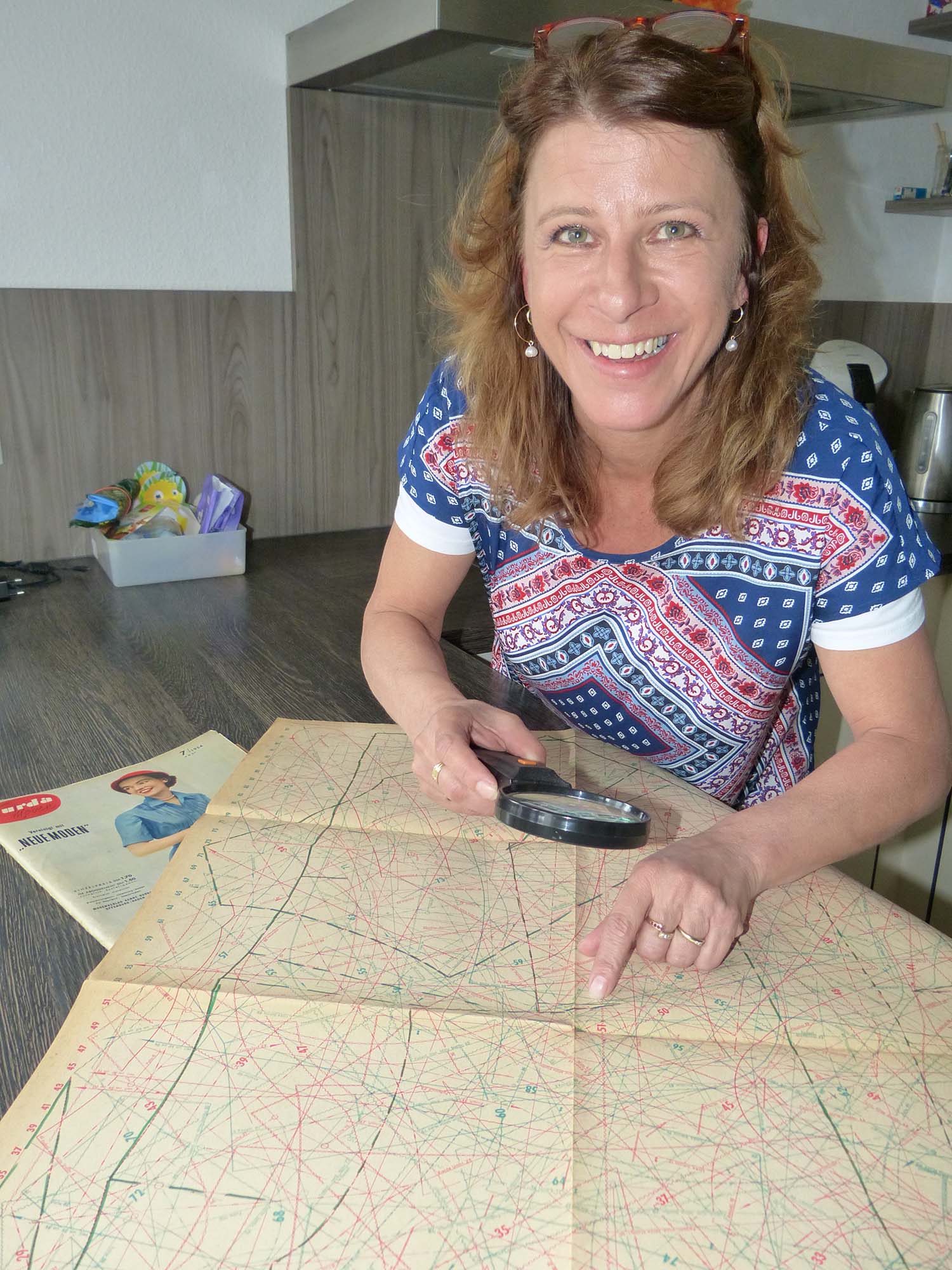 Nur mit Lupe findet sich die Schneidermeisterin in dem Liniengewirr des Burda-Schnittmuster­bogens aus den 50er Jahren zurecht.
