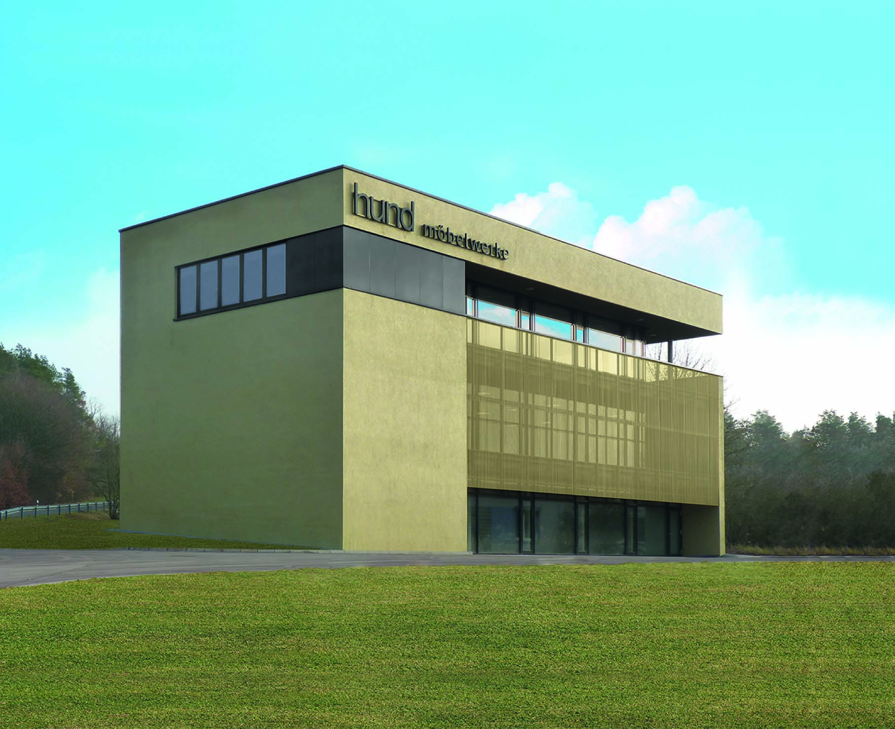 Tagsüber dominiert das markante Gebäudevolumen, bei Nacht und entsprechender Ausleuchtung gewährt es Blicke in das Gebäudeinnere und die Ausstellung durch die großflächigen Verglasungen. Es entsteht ein attraktiver Spannungsbogen. Das Ausstellungsgebäude entspricht der Energieeinsparverordnung. Im Innern zeigt Hund Möbelwerke auf drei Stockwerken, wie stilvoll und elegant Empfangsbereiche in Unternehmen gestaltet werden können, was eine gute Einrichtung von Konferenzräumen auszeichnet und wie mittelständische Unternehmen den Anforderungen moderner Büroarbeit gerecht werden können. »Unsere intelligente Modularität schafft individuelle und vielfältige Arbeitsumfelder in einer sich stetig wandelnden Arbeitswelt«, so Geschäftsführer André Hund, »insbesondere auf der zweiten Etage zeigen wir eindrücklich, wie sich Arbeit in offenen Bürostrukturen organisieren lässt«, so André Hund, »wie ermöglichen Arbeitgeber gleichzeitig