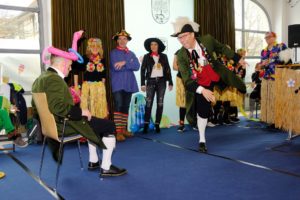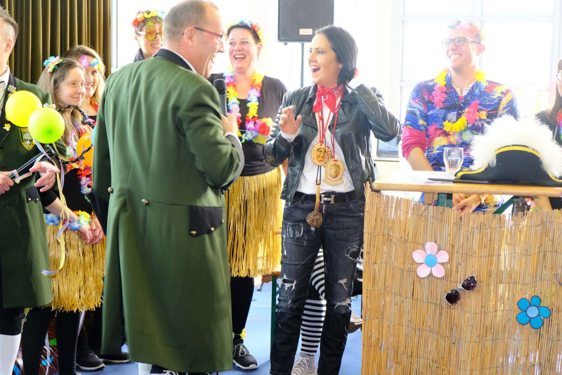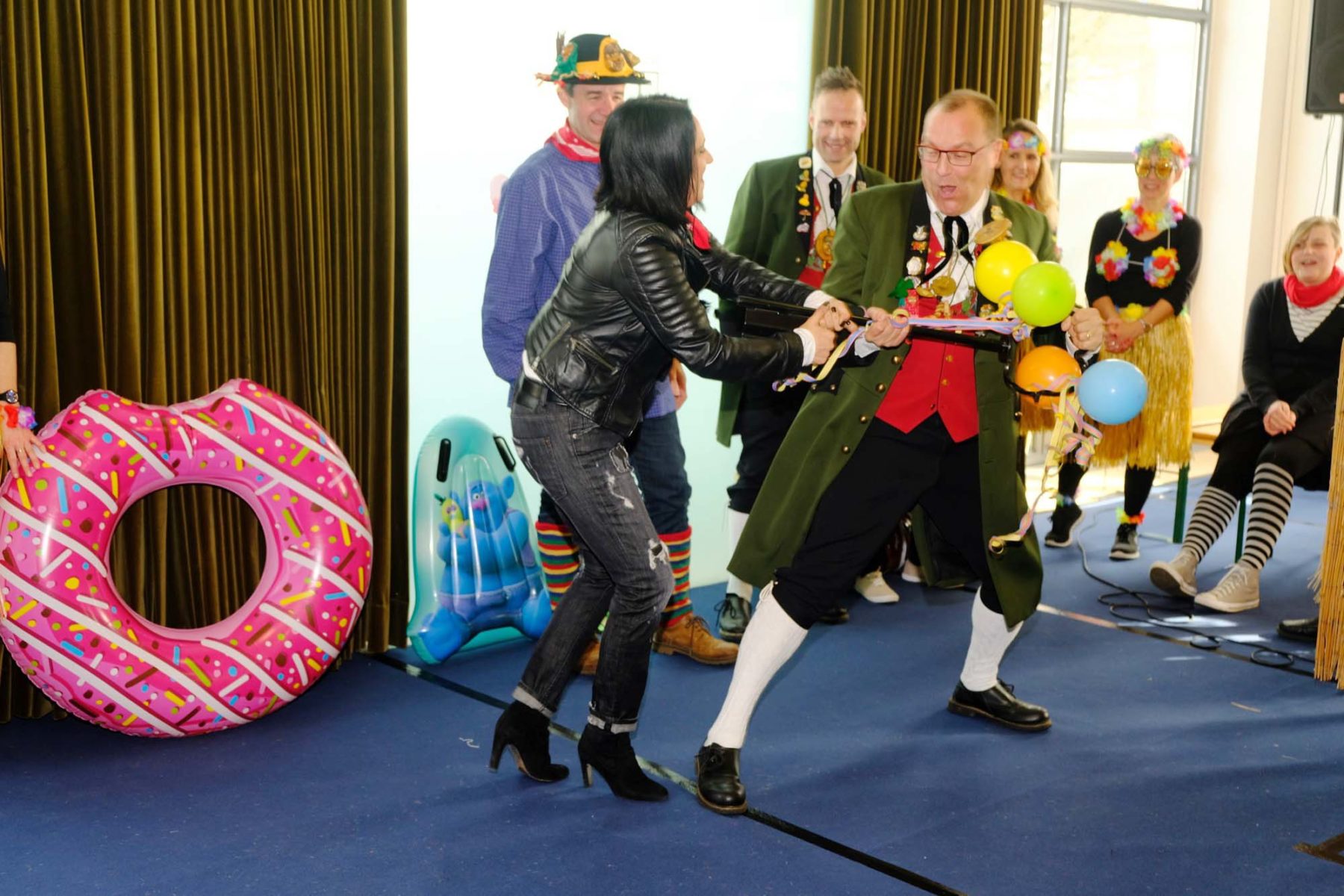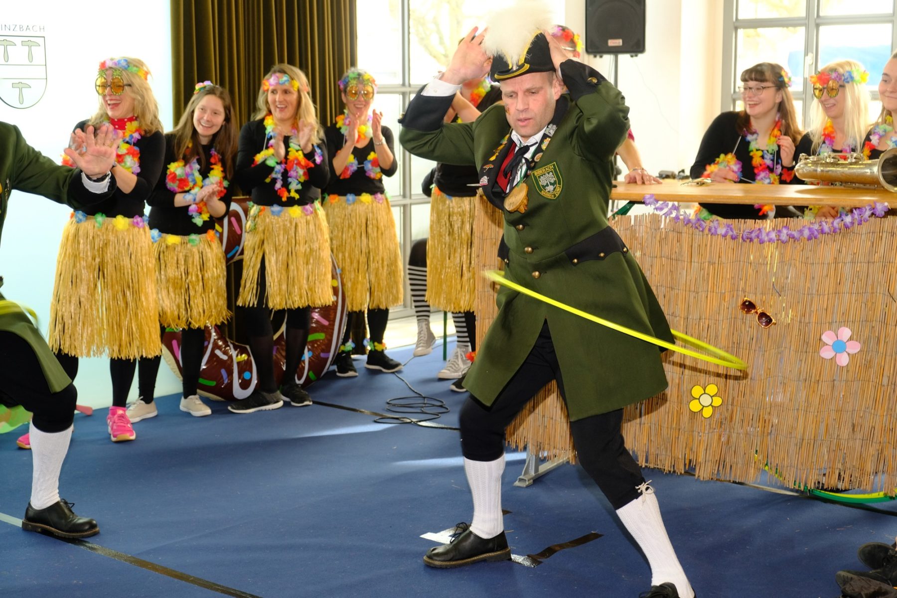 Für das Rathaus-Team kam der »Überfall« mitnichten überraschend. Sie hatten eine »Beachparty am Kinzig-Strand« vorbereitet und empfingen die Besucher sommerlich gekleidet im Bastrock (auch Kämmerer Nicolas Isenmann hatte sich dem Dresscode angeschlossen) im Bürgersaal. Der Kampf um den Rathausschlüssel absolvierten die Parteien mit lustigen Spielen. Daniela Paletta, Klaus Beck, Helmut Büdel und Timo Lienhard mussten ihre Hüften kreisen lassen und Wurfgeschick beweisen. Dumm nur, dass nicht das Ergebnis zählte, sondern die Anwesenden per Applaus über den Gewinner abstimmen durften. Die Narren waren in der Überzahl – und so war das Ergebnis am Ende nicht überraschend. Die Ortsverwaltung wurde für die närrischen Tage abgesetzt. Überraschender waren andere Dinge. Der Oberzunftmeister überreichte der Bürgermeisterin zu ihrem Biberbändel endlich einen Hexenbändel und die Bürgermeisterin hatte ein dickes Danke für ihre »Fasentsfachangestellte« Heike Jogerst dabei in Form eines bunten Blumenstraußes.