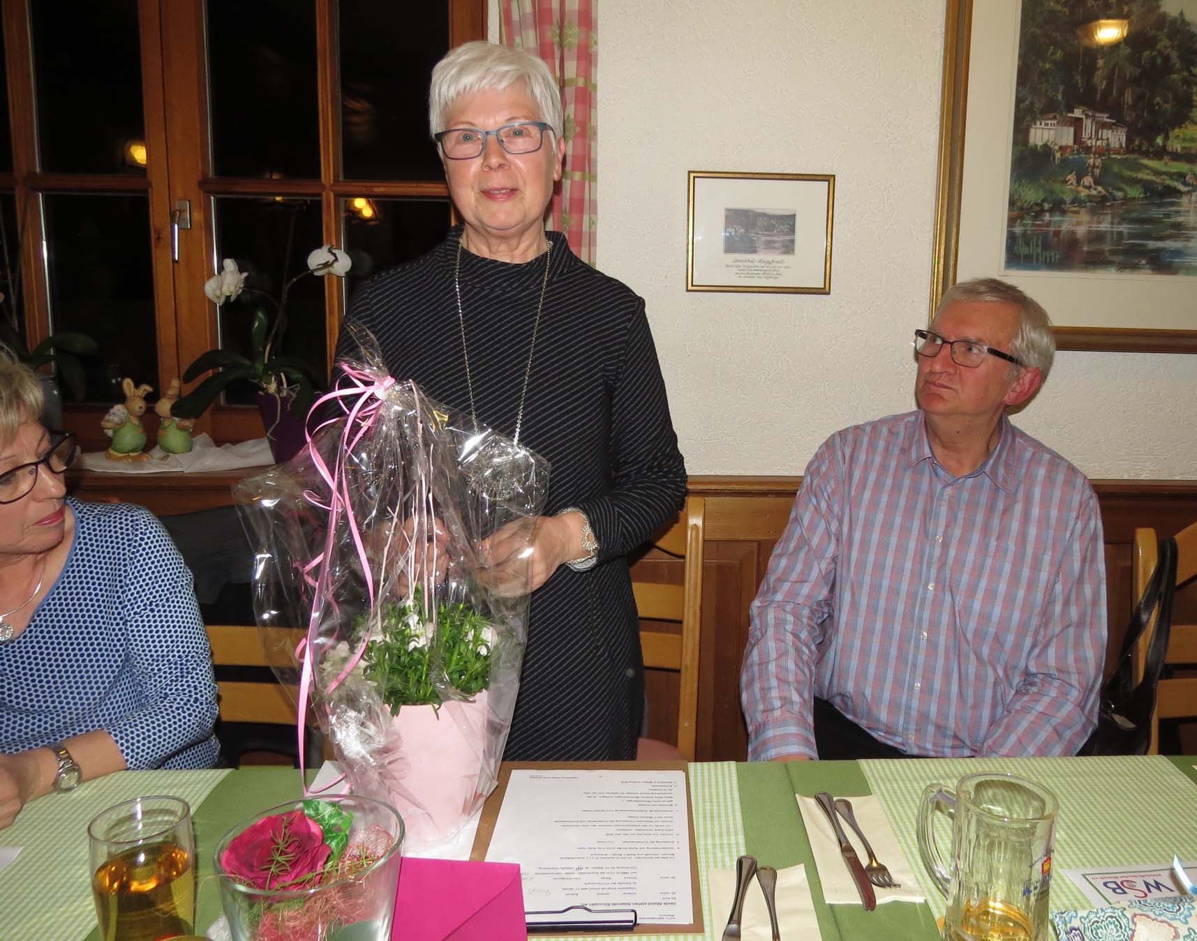 Auch die Vorsitzende des Chores, Agathe Schneider, wünschte Sonja Große alles Gute für die Zukunft und überreichte ihr als Abschiedsgeschenk die Anstecknadel des Chores, ein Präsent und Blumen.