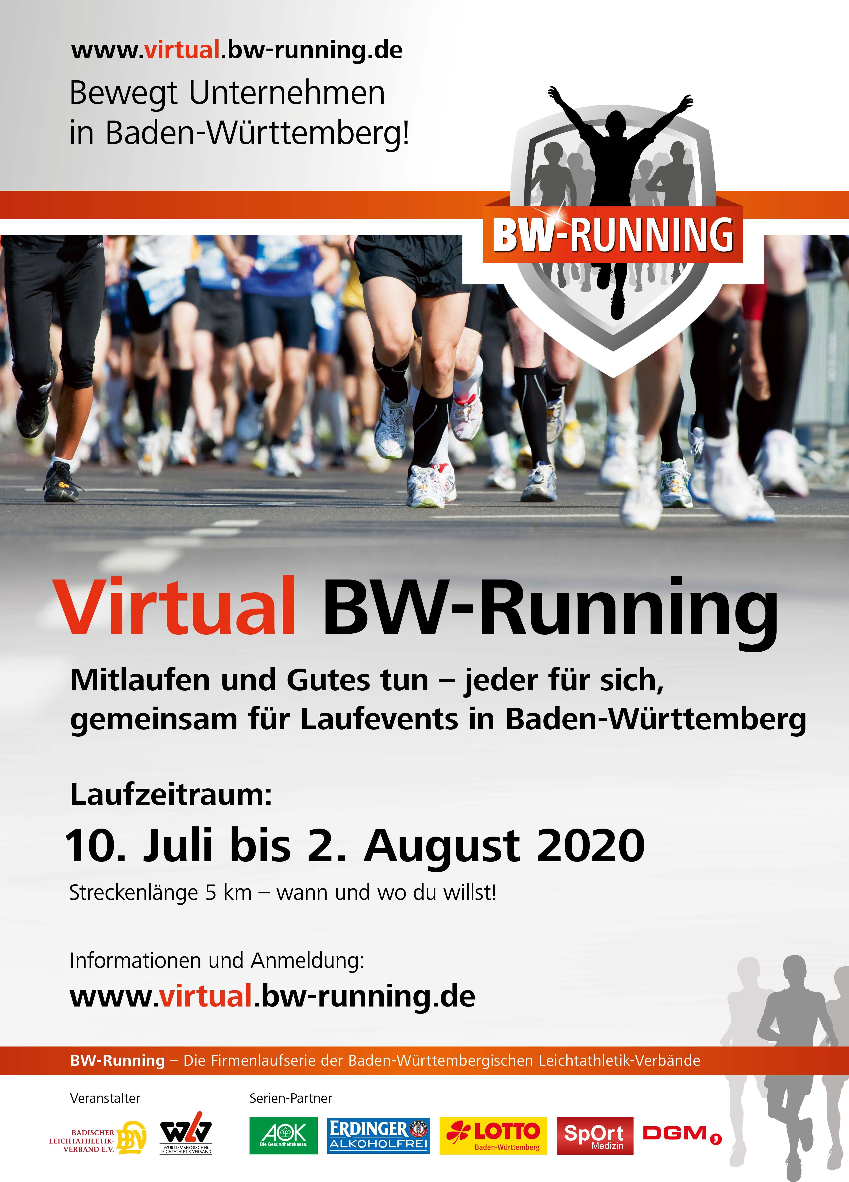 Der Badische und Württembergische Leichtathletik-Verband haben aus diesem Grund eine neuartige Laufveranstaltung entwickelt, welche ab sofort durchgeführt werden kann: Der Virtual BW-Running. Grundsätzlich ist dieser Lauf ein Ersatzlauf für die ausgefallenen BW-Running-Läufe im Juli. Aber auch alle anderen Läuferinnen und Läufer haben die Möglichkeit daran teilzunehmen.