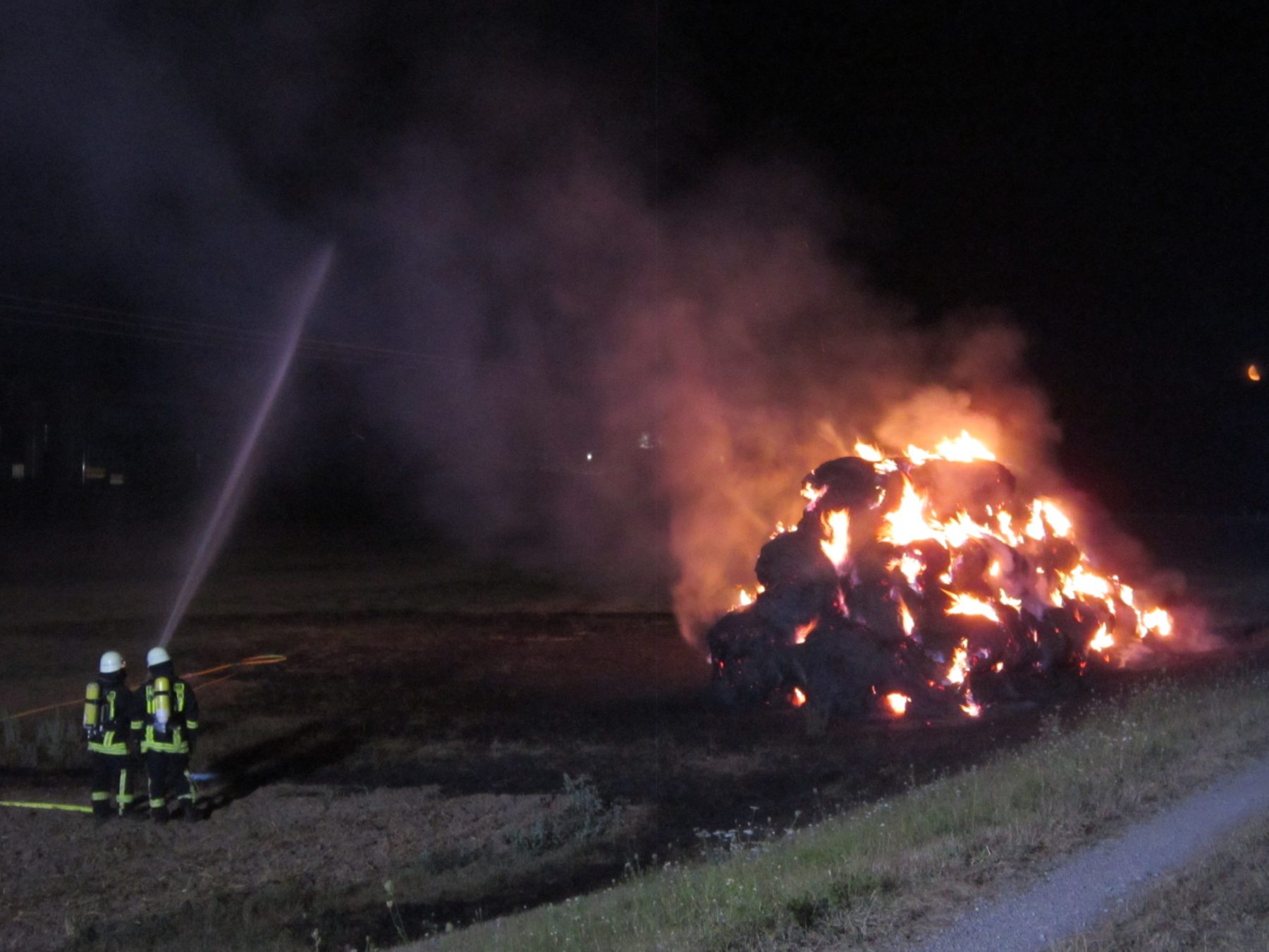 Die Strohballen standen bereits lichterloh in Flammen, sodass nur noch ein kontrolliertes Abbrennen lassen des Brandmaterials möglich war. Die umliegende Wiese, die ebenfalls Feuer gefangen hatte, wurde abgelöscht und anschließend durch Befeuchten vor einem weiteren Übergreifen der Flammen geschützt. Das dafür benötigte Wasser wurde dem nahegelegenen Erlenbach entnommen.