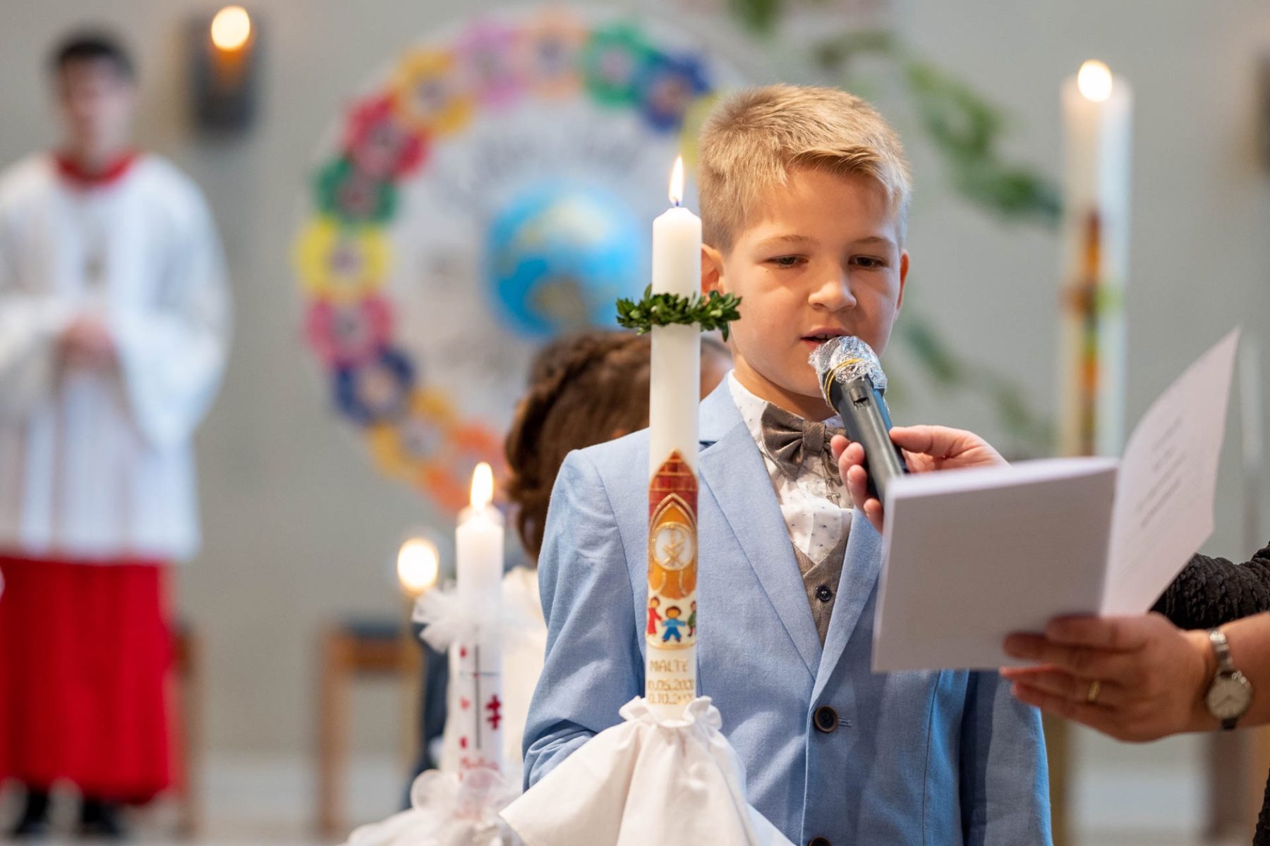 Beim feierlichen Höhepunkt durften die Kinder dann ihre Erstkommunion in Empfang nehmen. Andächtig nahmen sie die Hostie von Pfarrer Gerner entgegen. Nach der Kommunion sangen die Kinder das Lied »Du bist anders« um auszudrücken, dass jeder Mensch ein anderer Mensch ist, und jeder Mensch etwas Besonderes und Einmaliges ist.