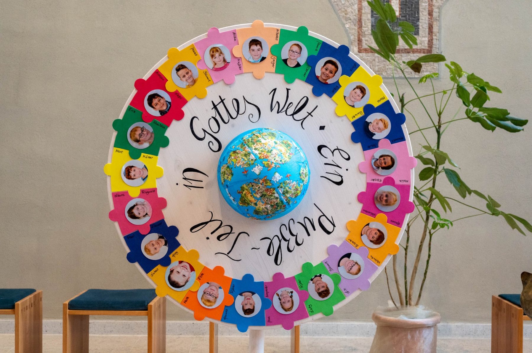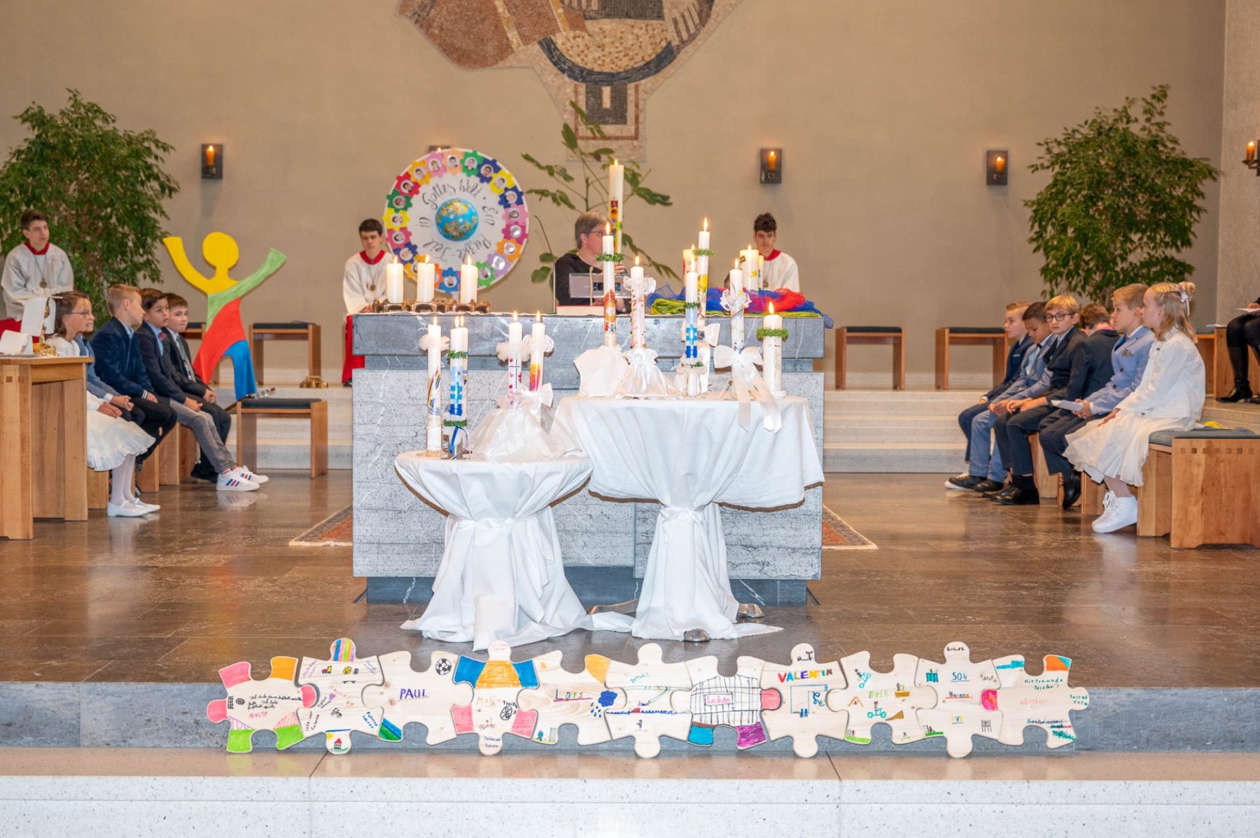 Nach der Lesung und dem Evangelium legten die Kinder ihre selbst gestalteten Puzzle-Teile vor dem Altar zu einer Kette zusammen.