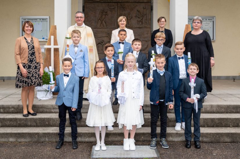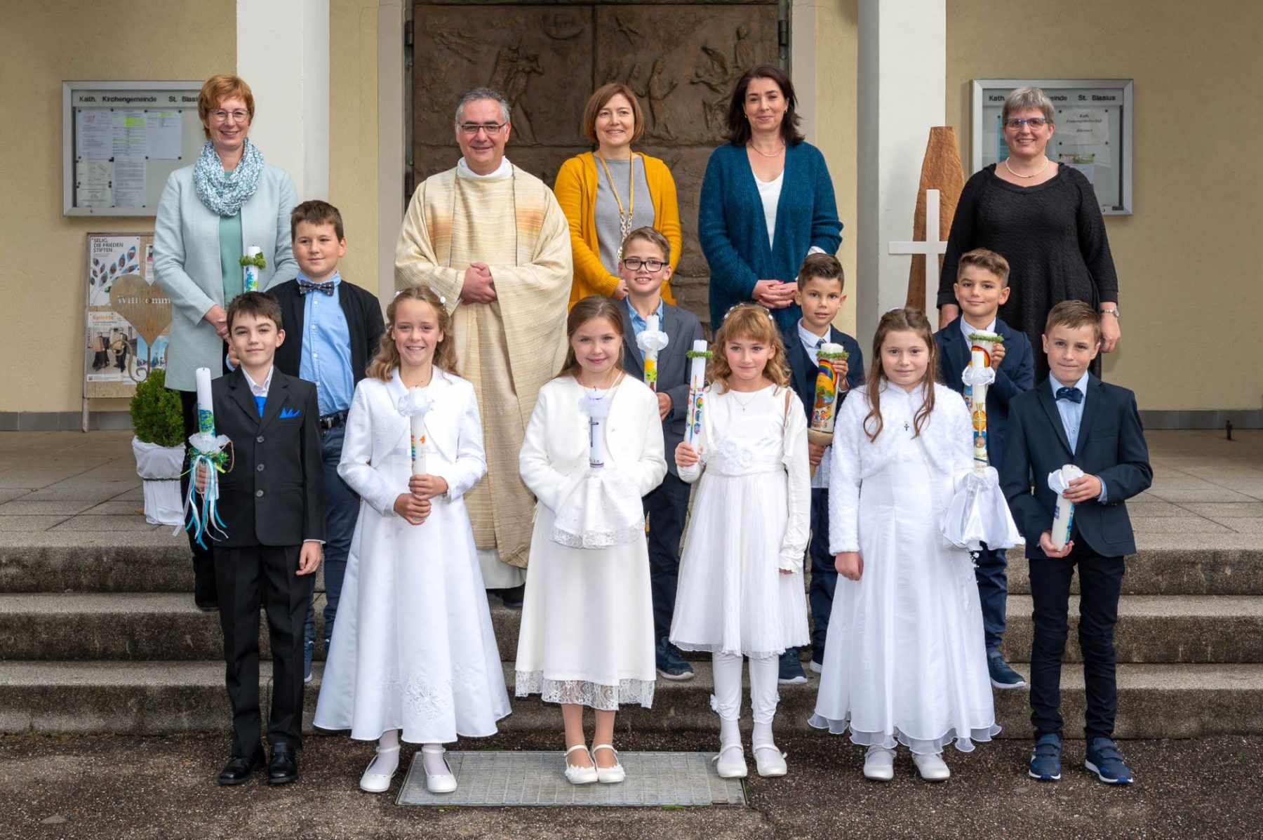 Die Erstkommunionkinder der Gruppe 1 zusammen mit Pfarrer Gerner, Gemeindereferentin Anke Haas und den Gruppenleiterinnen: Valentin Bischler, Jonas Bohnert, Malte Eble, Paul Fauser, Malia Förster, Lukas Holz, Ardijan Lapi, Hanna Lehmann, Lars Riedl, Erik Rombach, Hannes Schilli.