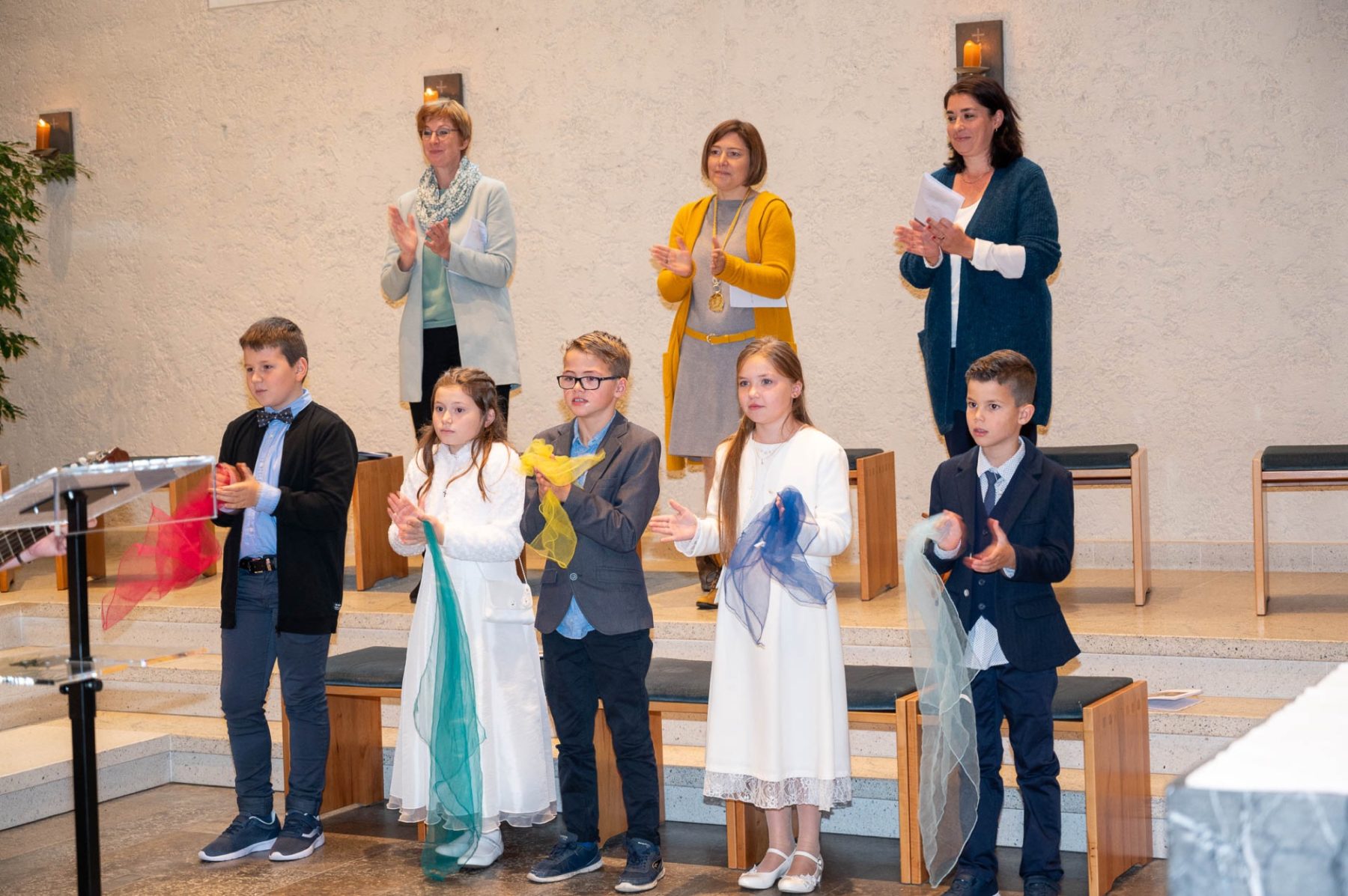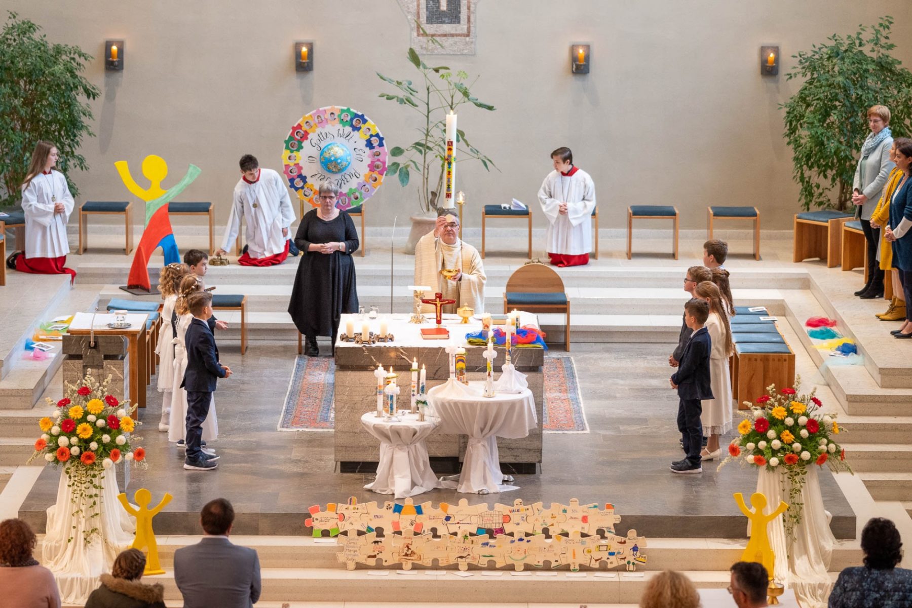 Die Gruppengröße erlaubte es, dass sich die Kinder während der gesamten Feier im Altarraum aufhalten konnten, was eine besondere Atmosphäre der Verbundenheit bewirkte.