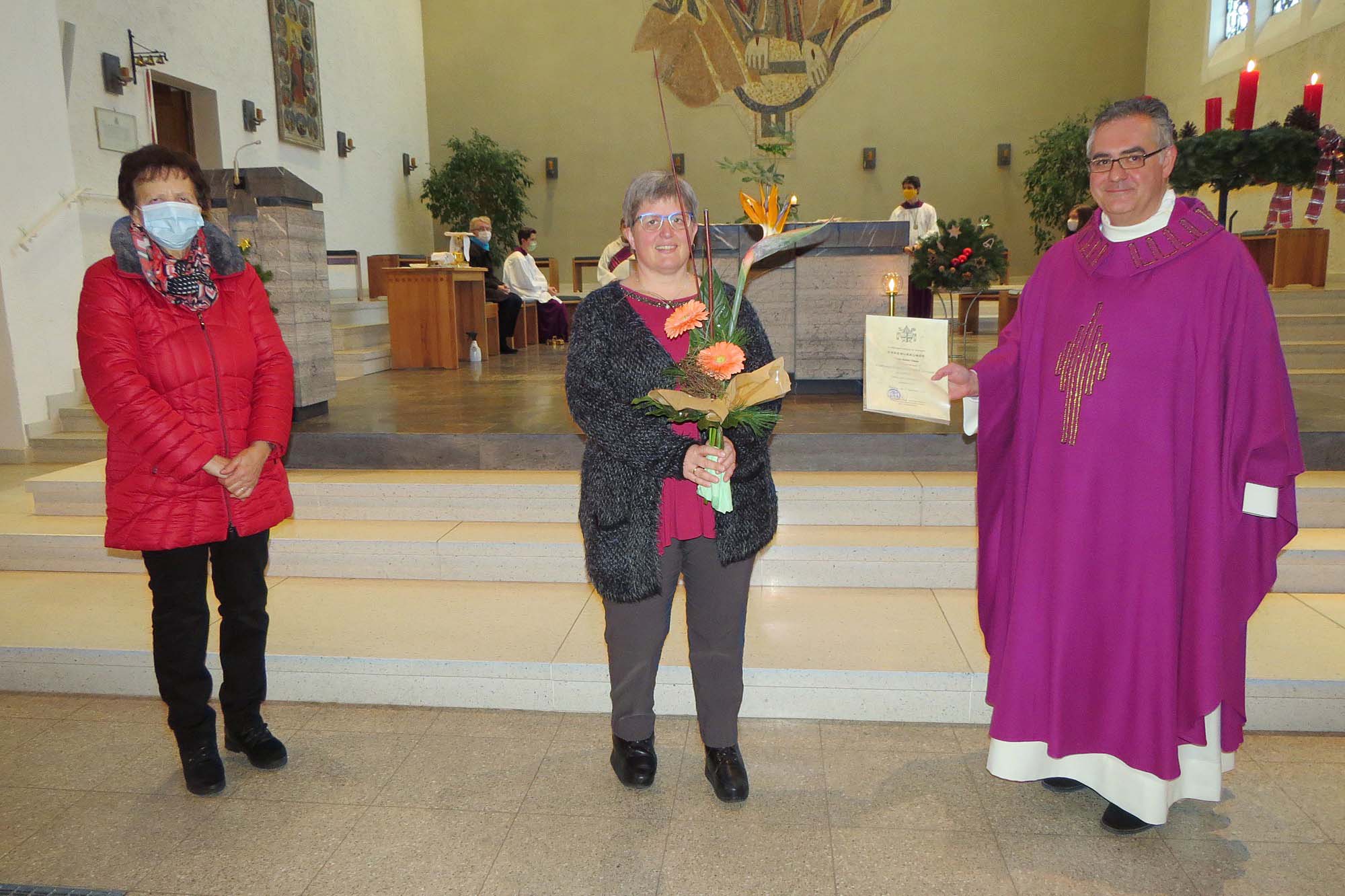 Aufgrund der Corona-Bedingungen konnte die geplante kleine Feier mit anschließendem Sektempfang nicht stattfinden. Darum wurde die Ehrung von Anke Haas auf den Gottesdienst zum 2. Advent in Biberach beschränkt. Pfarrer Bonaventura Gerner berichtete von einem Telefongespräch diesbezüglich mit Anke Haas, die ihre Ehrung einfach ausfallen lassen wollte, weil ihr »das nicht so wichtig sei«. Darin komme zum Ausdruck, wie Anke Haas ihren Dienst verstehe und lebe, erklärte Pfarrer Gerner. »Deine freundliche und ruhige Art und deine Hilfsbereitschaft tragen dazu bei, dass wir im Seelsorgeteam ein schönes und herzliches Miteinander haben. Wir habe dich sehr gerne bei uns.« Er bedankte sich für alles, was sie für die Hauptamtlichen und die Menschen tue und betonte, dass sie ihren Dienst stets mit viel Herzblut ausübe. Pfarrer Gerner überreichte ihr Blumen und die Urkunde des Bischofs sowie einen Gutschein für eine gemeinsame Aktivität mit der Familie.