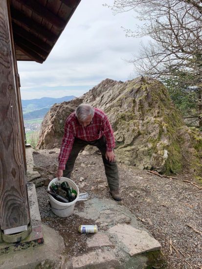 Die dreistündige Aufräumarbeit wurde von der Vorstandschaft des Schwarzwaldvereins Biberach, Manfred und Angelika Krauß, erledigt. Eine Bitte an die mündigen Mitbürger/innen: »Nehmen sie ihre mitgebrachten Dosen, Flaschen und Butterbrotpapier nach dem Vesper wieder mit nach Hause. Der nächs- te Wanderer/in freut sich über einen sauberen Platz in und um die Siegfried-Liebert- Hütte.«