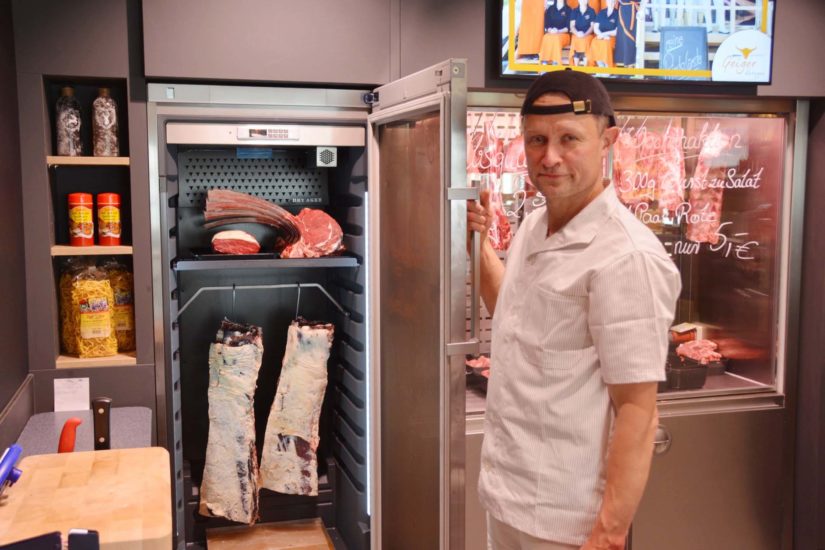 Der Reifeschrank befindet sich in der Fleischabteilung des neu gestalteten Verkaufsraums. Temperatur und Luftfeuchtigkeit sind im Reifeschrank exakt geregelt. Eine Schicht aus Himalaya-Salz nimmt die Feuchtigkeit auf. Das darin gelagerte Fleisch nimmt außen eine getrocknete Schicht an, die vor dem Zubereiten dann entfernt wird. Innen bleibt es saftig und ganz zart. »Wie bei unseren Schinkenspezialitäten bringt die Zeit die hohe Qualität«, betont Metzgermeister Thomas Geiger.