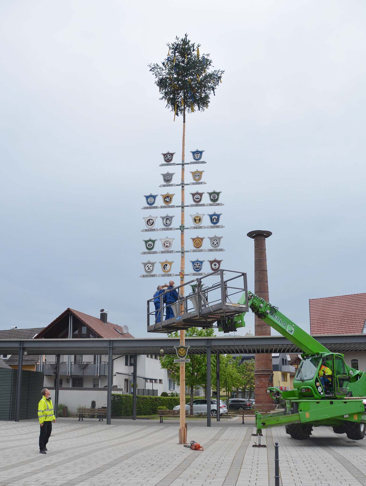 Gleich am Freitagmorgen in aller Frühe machten sich Betriebshofleiter Dirk Weise und das Team des Betriebshofs an die Arbeit und stellten den Maibaum auf. Die zwanzig Meter hohe, schlanke Tanne hatten sie zuvor im Gemeindewald geschlagen.