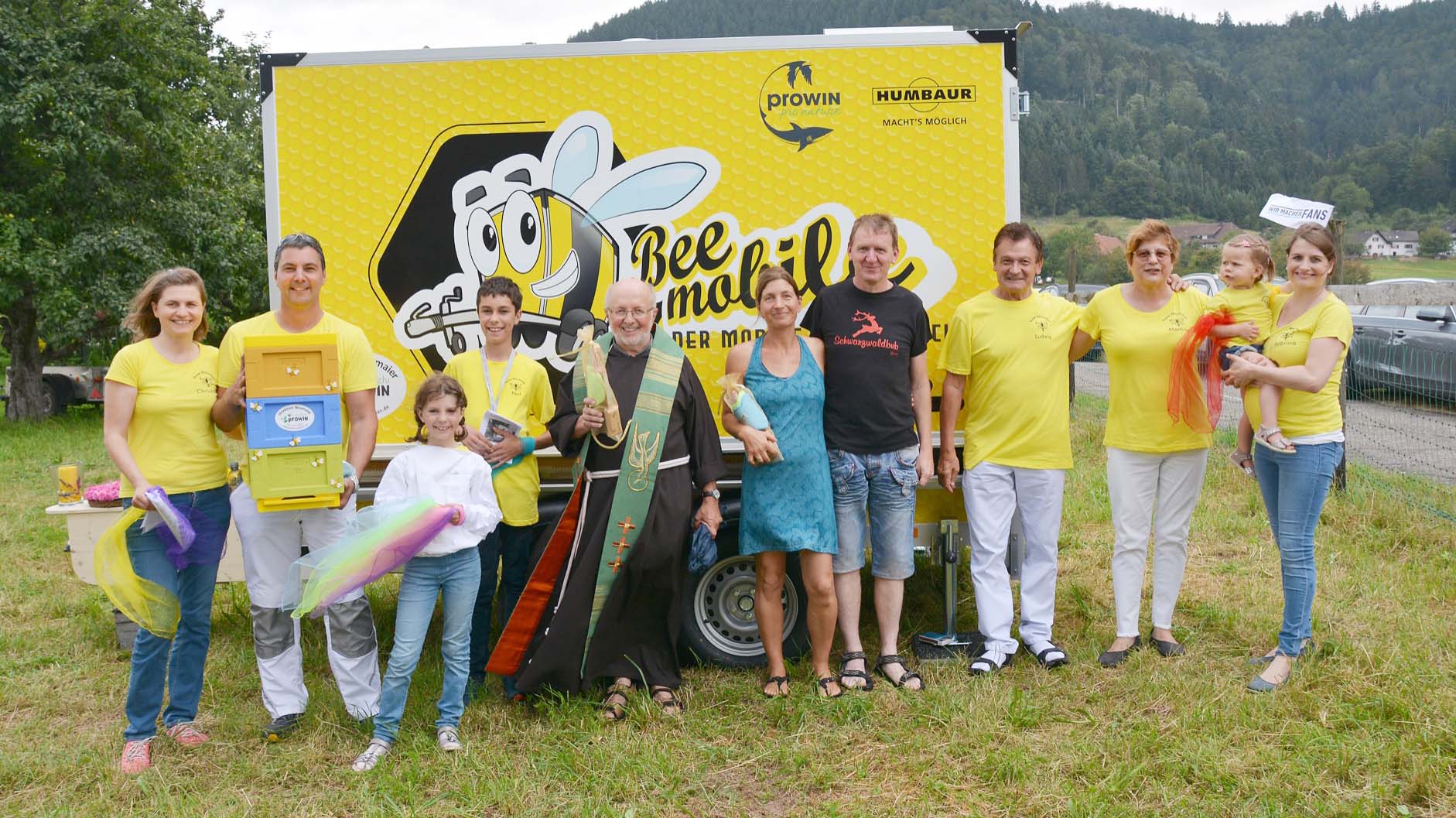 Feierliche Segnung des mobilen Bienenwagens (von links): Christiane und Rainer Schätzle mit ihren Kindern Paul und Marie, Pater Pius, Pia und Olaf Kornmayer-Krieg, Ludwig und Martina Neumaier sowie Sabrina Kornmayer mit Tochter Lea Marie. Foto: Hanspeter Schwendemann