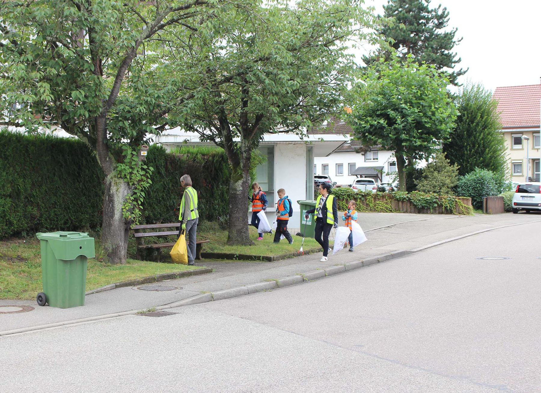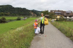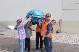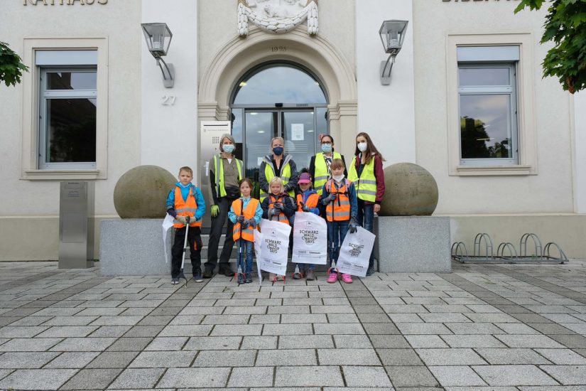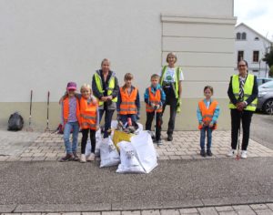 Das einsammeln, was andere achtlos wegwerfen – darum drehte sich alles beim Bürgermeisterinnen-Tag in diesem Jahr. Fünf Kinder, zwei Erwachsene und die Bürgermeisterin füllten in kürzester Zeit ausgestattet mit Müllzangen, Handschuhen und Warnwesten einen ganzen großen blauen Müllsack. Sie mussten nicht lange nach Unrat suchen. Schon wenige Schritte vom Rathaus weg wanderten die ersten Zigarettenkippen, Papiere und Folien, Glasflaschen, Getränkedosen und Masken in die Sammelbehälter.