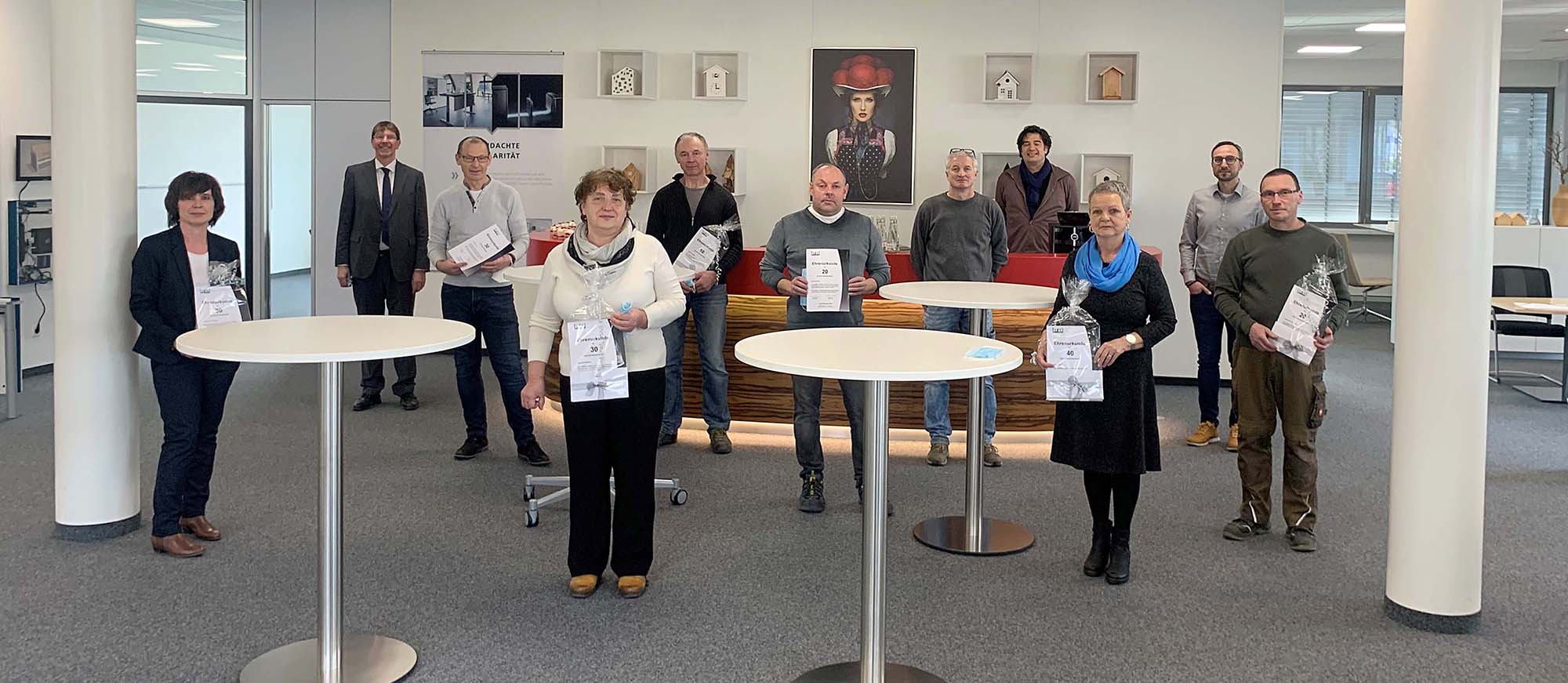 Geschäftsführer Hendrik Hund, in diesem Jahr selbst seit 30 Jahren für das Unternehmen tätig, ehrte in den Ausstellungsräumen des Unternehmens langjährige Mitarbeiterinnen und Mitarbeiter. Besonders ausgezeichnet wurde Martina Fix, die 40 Jahre für das Unternehmen tätig war. Anita Armbruster, Eugenia Hoffmann, Ronald Kuhnt und Siegfried Palt begleiten die Firma Hund seit 30 Jahren. Alexander Kraft und Thomas Schuhmacher wurden für 20-jährige Betriebstreue geehrt und Guido Hebecker sowie Boris Hepting arbeiten seit zehn Jahren bei Hund.