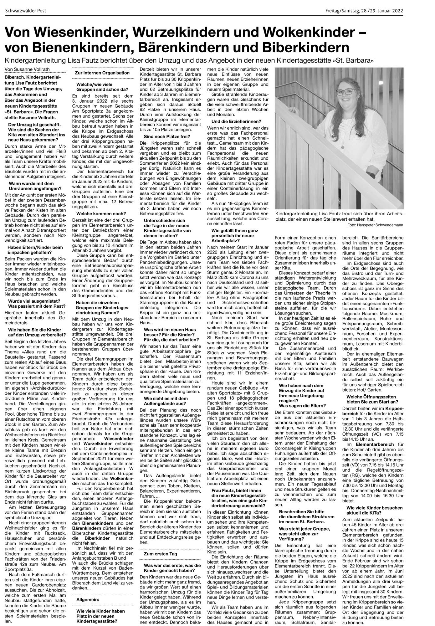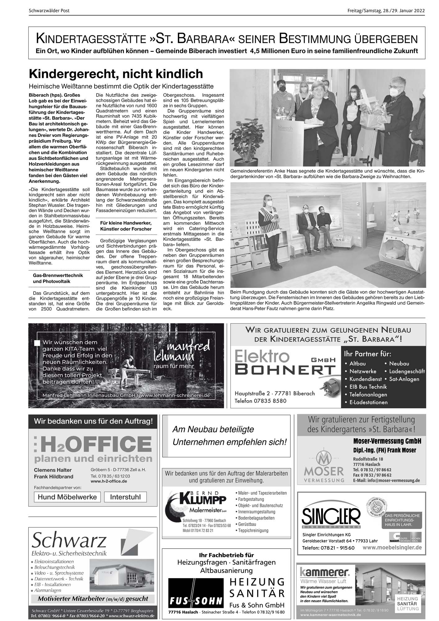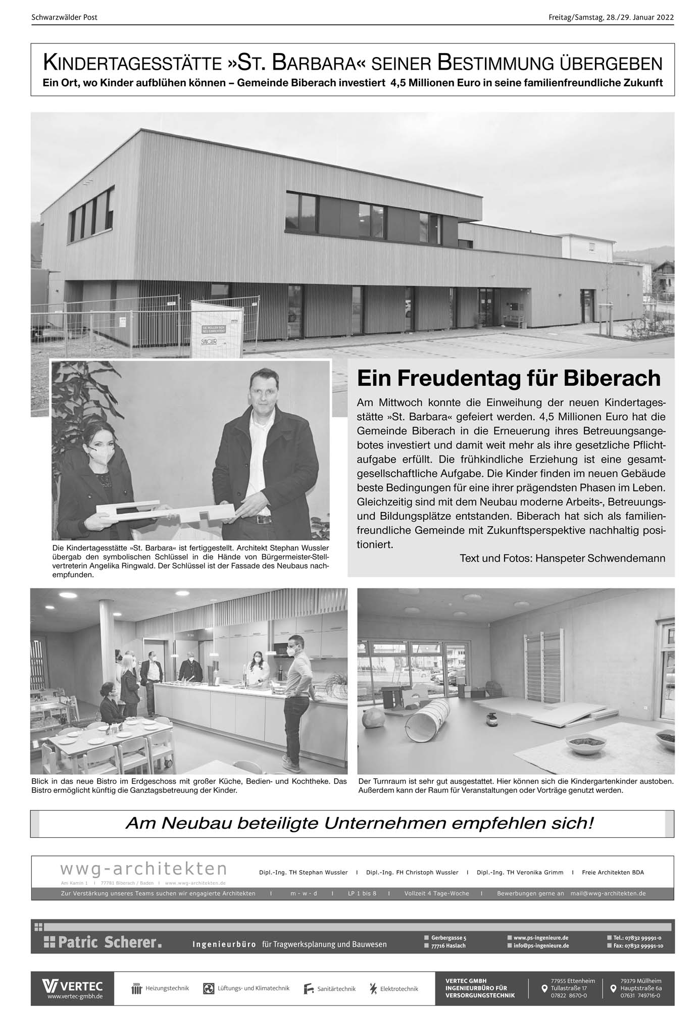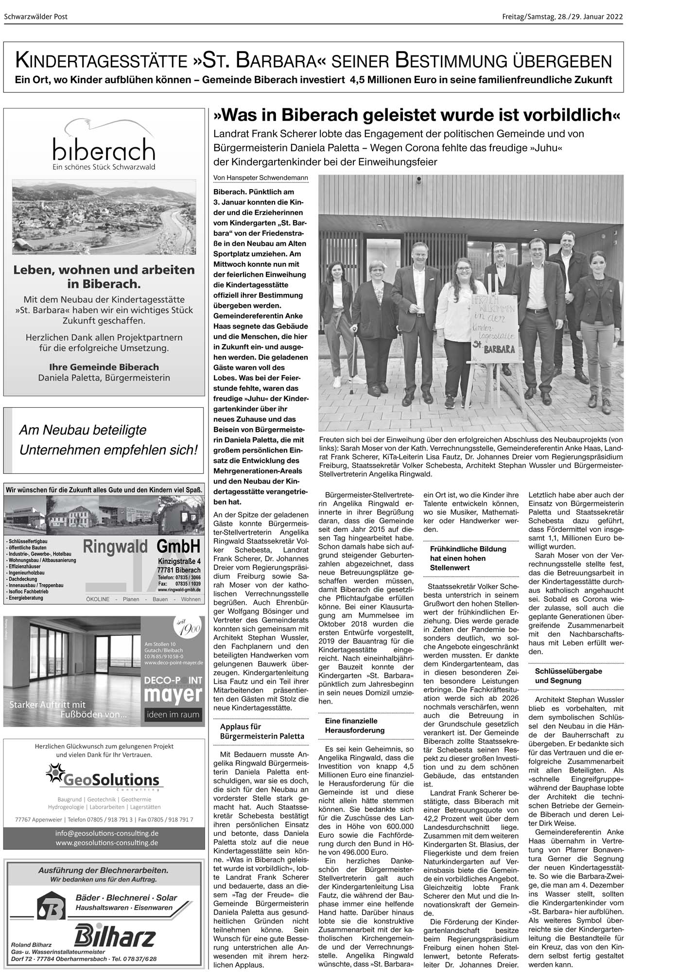 Am Mittwoch konnte die Einweihung der neuen Kindertages stätte »St. Barbara« gefeiert werden. 4,5 Millionen Euro hat die Gemeinde Biberach in die Erneuerung ihres Betreuungsange botes investiert und damit weit mehr als ihre gesetzliche Pflichtaufgabe erfüllt. Die frühkindliche Erziehung ist eine gesamt gesellschaftliche Aufgabe. Die Kinder finden im neuen Gebäude beste Bedingungen für eine ihrer prägendsten Phasen im Leben. Gleichzeitig sind mit dem Neubau moderne Arbeits-, Betreuungs- und Bildungsplätze entstanden. Biberach hat sich als familienfreundliche Gemeinde mit Zukunftsperspektive nachhaltig positioniert.