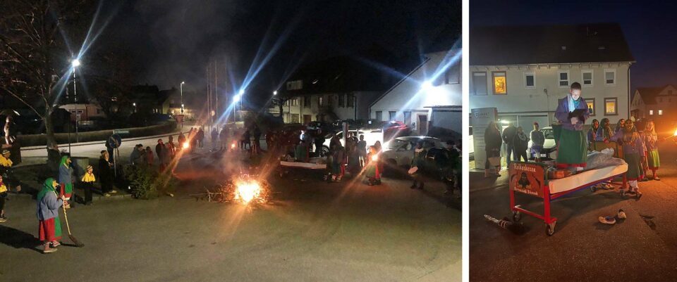 Am gestrigen Fasentdienstag ging zu nächtlicher Abendstunde die Biberach Fasent 2022 mit der traditionellen Hexenverbrennung zu Ende. Tobias Geiger von den Reiherhexen (rechts) beschwörte nochmals die Narrengeister mit einem letzten »Narri! Narro! S’goht degege, nächstes Johr wieder!«