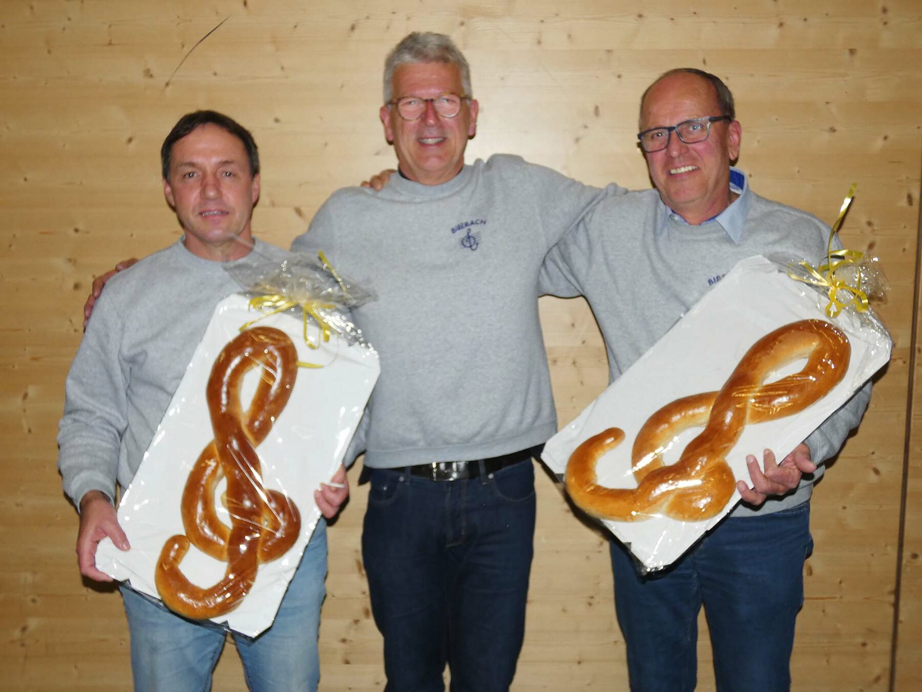 Über das Musizieren hinaus wurden die Musiker zudem für ihr weiteres, teils enormes Engagement im Musikverein gewürdigt. Eine Auszeichnung erhielten auch die besten Probenbesucher: Der scheidende Vize-Vereinsvorsitzende Manfred Dürr holder überreichte Jürgen Kürner sowie Werner Witschel zum Dank einen großen gebackenen Notenschlüssel – beide besuchten sämtliche der 19 Proben, die im Pandemie-Jahr 2021 hatten stattfinden können.