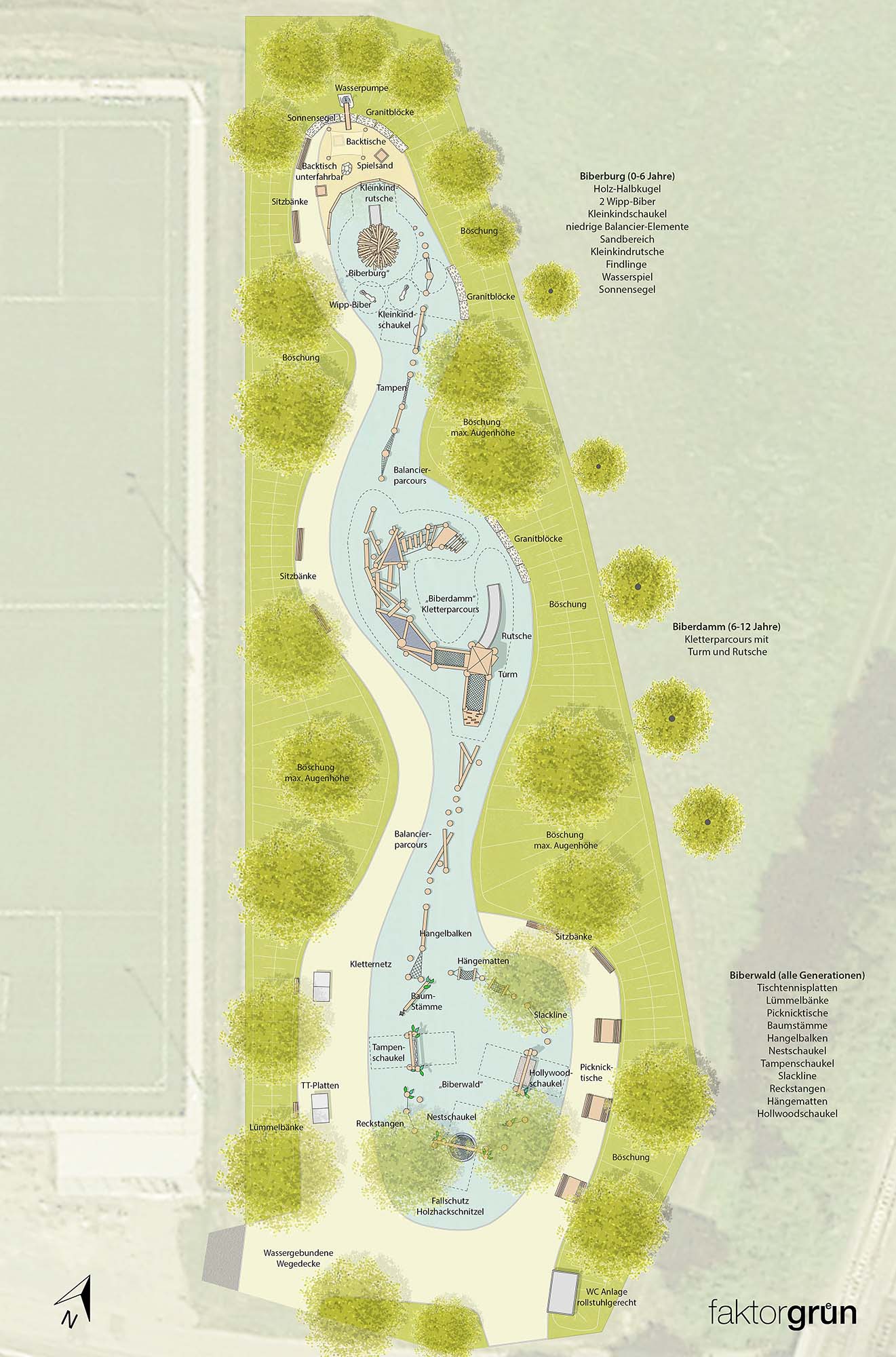 Landschaftsarchitekt Vanja Deschler vom Planungsbüro faktorgruen aus Freiburg stellte das Konzept vor. Die geplante Begegnungsstätte im Zeichen des Bibers soll als großzügiger und inklusiver Spiel- und Aufenthaltsort ein Treffpunkt für alle Generationen werden. Neben Spielangeboten für Kinder sollen auch für Jugendliche, Familien, Senioren und Beeinträchtigte Angebote auf dem Spielplatz zu finden sein. Als Bauplatz ist ein keilförmiges Grundstück in der Brucherstraße zwischen dem Kunstrasenplatz und der Bahntrasse vorgesehen. Dieses Grundstück ist bereits im Besitz der Gemeinde.
