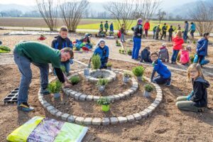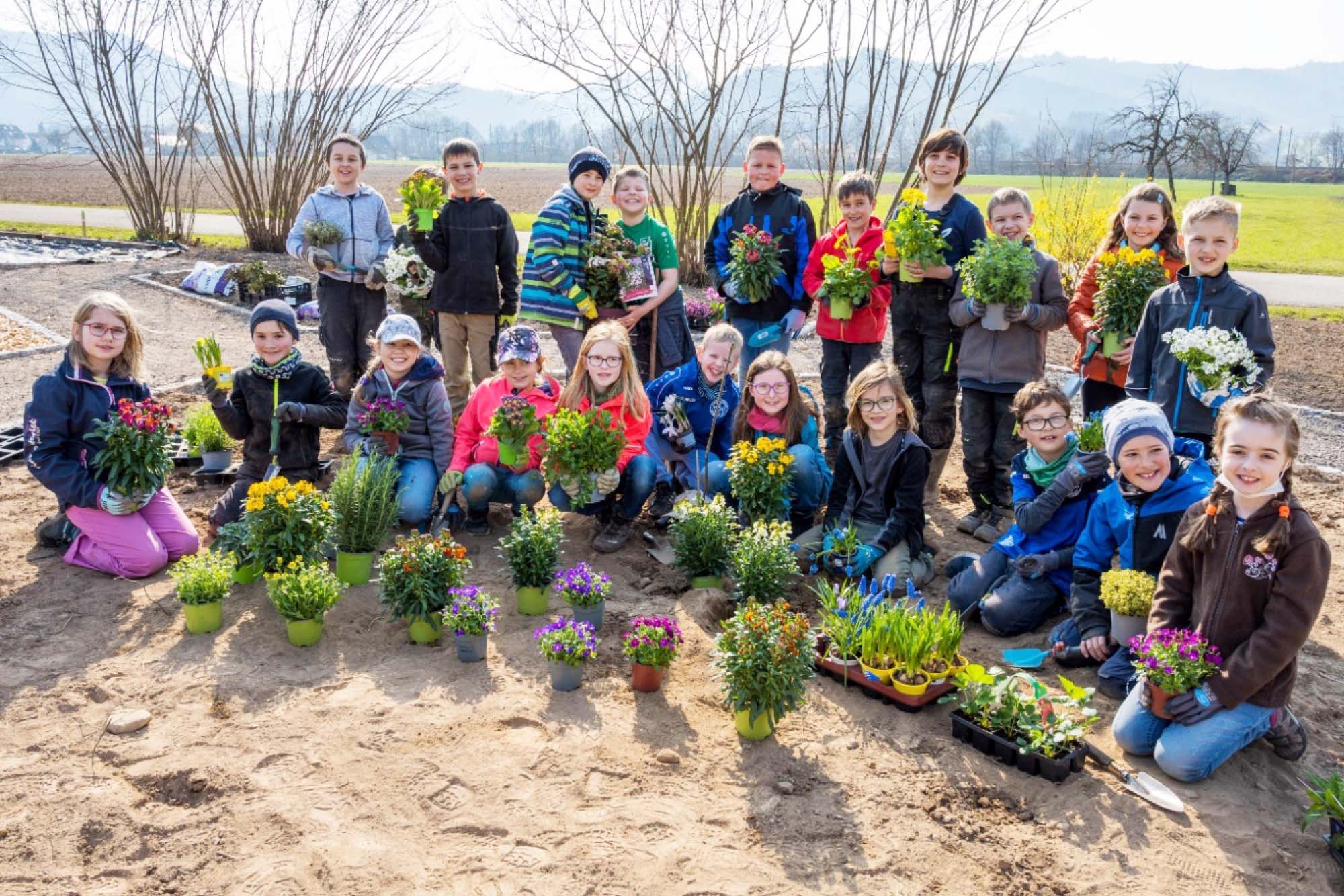 Ausgestattet mit Spaten, Handschuhen und Gießkanne machten sich am Nachmittag die 22 Kinder und ihre Begleitmütter mit viel Vorfreude auf den Weg zum Bienenplatz. Vor Ort wurden sie von Rainer Schätzle, der die Aktion sponsernden Firma Blumen-Göppert aus Haslach und der Gemeindereferentin Anke Haas, empfangen. Die Firma Blumen-Göppert wurde durch Katrin Birk, welche die Aktion plante und fach-fraulich koordinierte, als auch durch den Geschäftsführer Johannes Wöhrle vertreten.