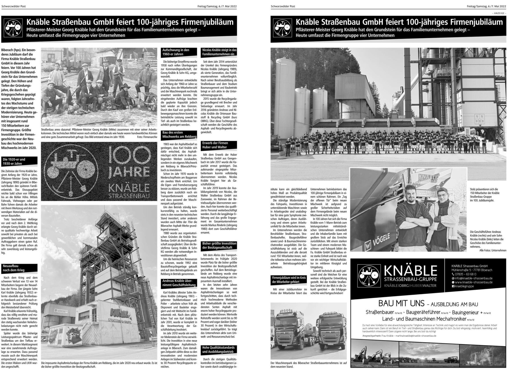 Ein besonderes Jubiläum darf die Firma Knäble Straßenbau GmbH in diesem Jahr feiern. Vor 100 Jahren hat Georg Knäble den Grundstein für das Unternehmen gelegt. Den Höhen und Tiefen der Gründungs jahre, die durch das Kriegsgeschehen geprägt waren, folgten Jahrzehntes des Wachstums und der stetigen technischen Modernisierung. Heute gehören vier Unternehmen mit insgesamt rund 150 Mitarbeitern zur Firmengruppe. Größte Investition in der Firmengeschichte war der Neubau des hochmodernen Mischwerks im Jahr 2020.