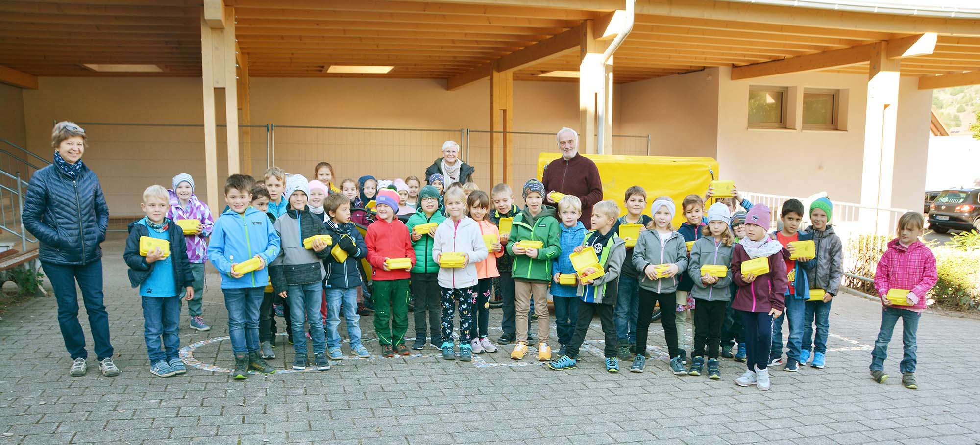 Das Pausenfrühstück der Kinder soll gesund, lecker und möglichst vitaminreich sein. Frisches Obst und Gemüse, direkt vom Bio-Landwirt, vereint gewiss all diese Vorzüge. Deshalb hat der Unterentersbacher Demeter- Landwirt vor wenigen Tagen den Biberacher Erstklässlern eine gut gefüllte »Bio-Brotbox« überreicht. Schon seit mehreren Jahren fördert er damit die iberacher Schulkinder.
