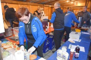Mit dem feierlichen Einschalten der Weihnachtsbeleuchtung bei einsetzender Dämmerung gipfelte die kleine Eröffnungszeremonie in ihren Höhepunkt. Fortan leuchtet die Riesenkerze am Rietschekamin wieder für alle weithin sichtbar – und das in stromsparender LED-Technik. „Allerdings in diesem Jahr nur von 17 bis 22 Uhr“ informierte Hans-Peter Fautz. In Zeiten der Energiekrise gelte es ein Zeichen zu setzen und so wurde die ansonsten üppige Weihnachtsbeleuchtung deutlich reduziert und zeitlich beschränkt. Auch auf die beliebten Kerzen an Straßenlaternen, vor Geschäften, und am Ortseingang, welche der Gemeinde den Beinamen »Kerzendorf« beschert haben, wird in diesem Jahr ausnahmsweise mal verzichtet.