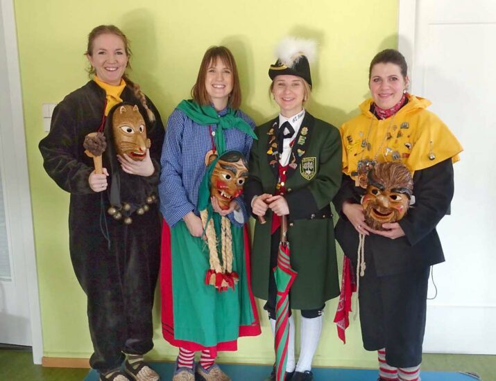In erster Linie sollten die Kinder die Narrenfiguren Biberachs kennenlernen und eventuelle Ängste verlieren. Mit viel Geduld stellten je eine Narrenrätin, eine Reiherhexe, ein Bergwerksgeist und ein Biber ihr Häs, mit allem Zubehör, vor.