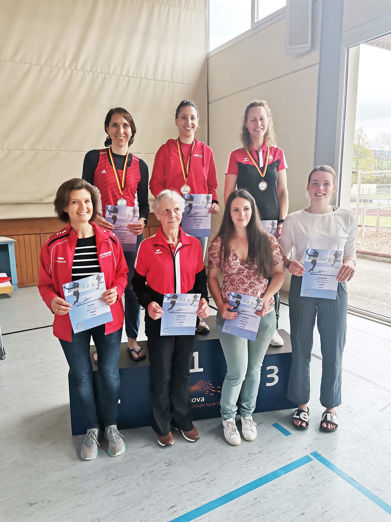 Die Frauen freuen sich über ihren Erfolg bei den Süddeutschen Meisterschaften im Straßengehen. Oben: Linda Betto, Silvia Cormaci, Liane Jörs. Unten: Tina Herr, Ursula Klink (7. Süddeutsche Meister – TV 1846 Groß Gerau), Lisa Wälde (6. Süddeutsche Meister, 4. Badische Meister - TV Biberach), Lara Schmidt (8. Süddeutsche Meister – TSV Eintracht Stadtallendorf ).