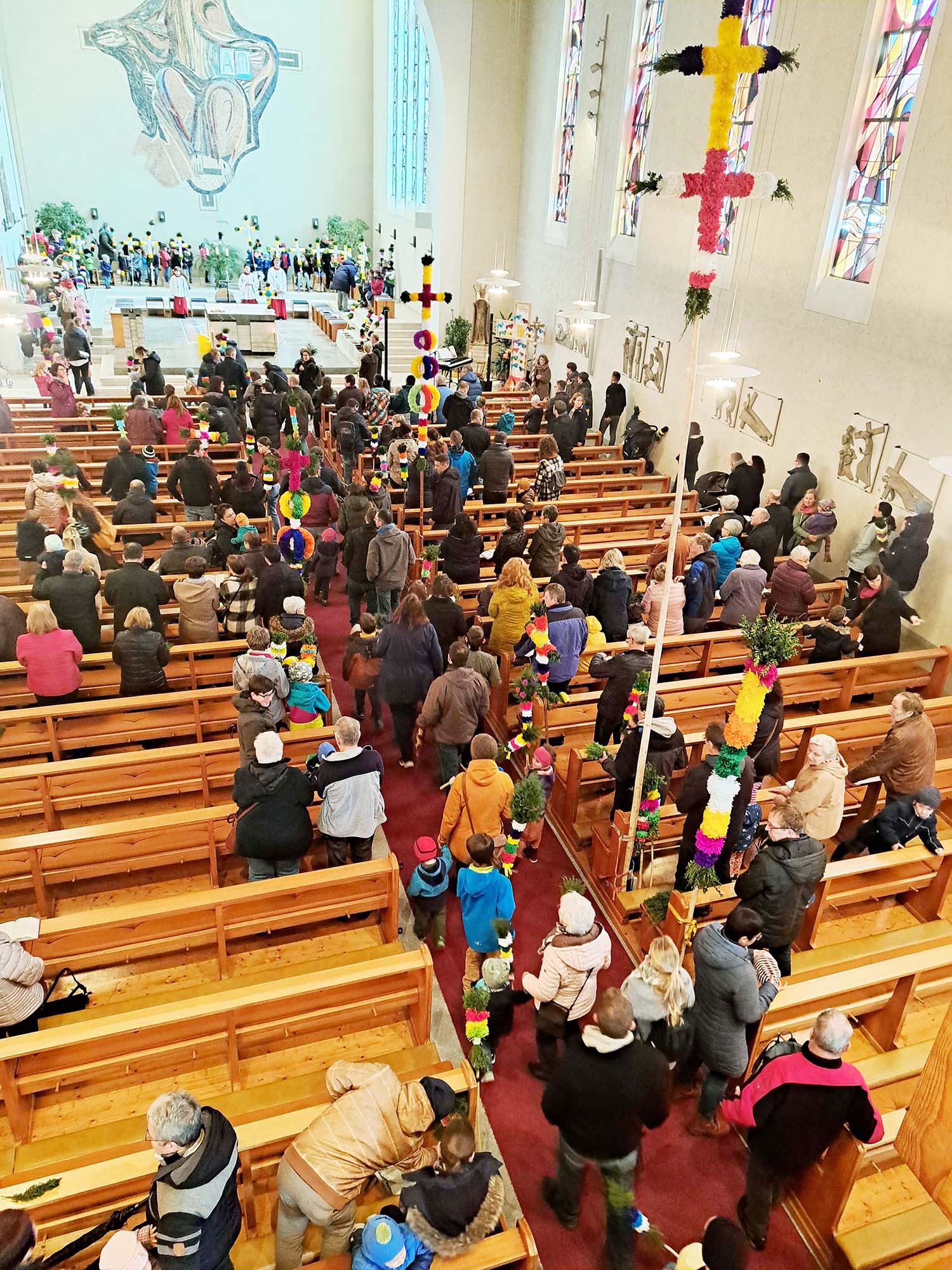 Nach der Segnung der Palmen und dem Evangelium vom Jesu Einzug in Jerusalem gingen alle Kinder mit den Erwachsenen in einer Prozession in die Kirche. Dabei wurden sie bei dem Lied »Singt dem König Freudenpsalmen, Völker ebnet seine Bahn« von der Organistin Maria Totzke auf der Orgel begleitet. Die Kindergartenkinder mit ihren Erzieherinnen sangen zum Beginn des Wortgottesdienstes das Lied »Jesus zieht in Jerusalem ein«.