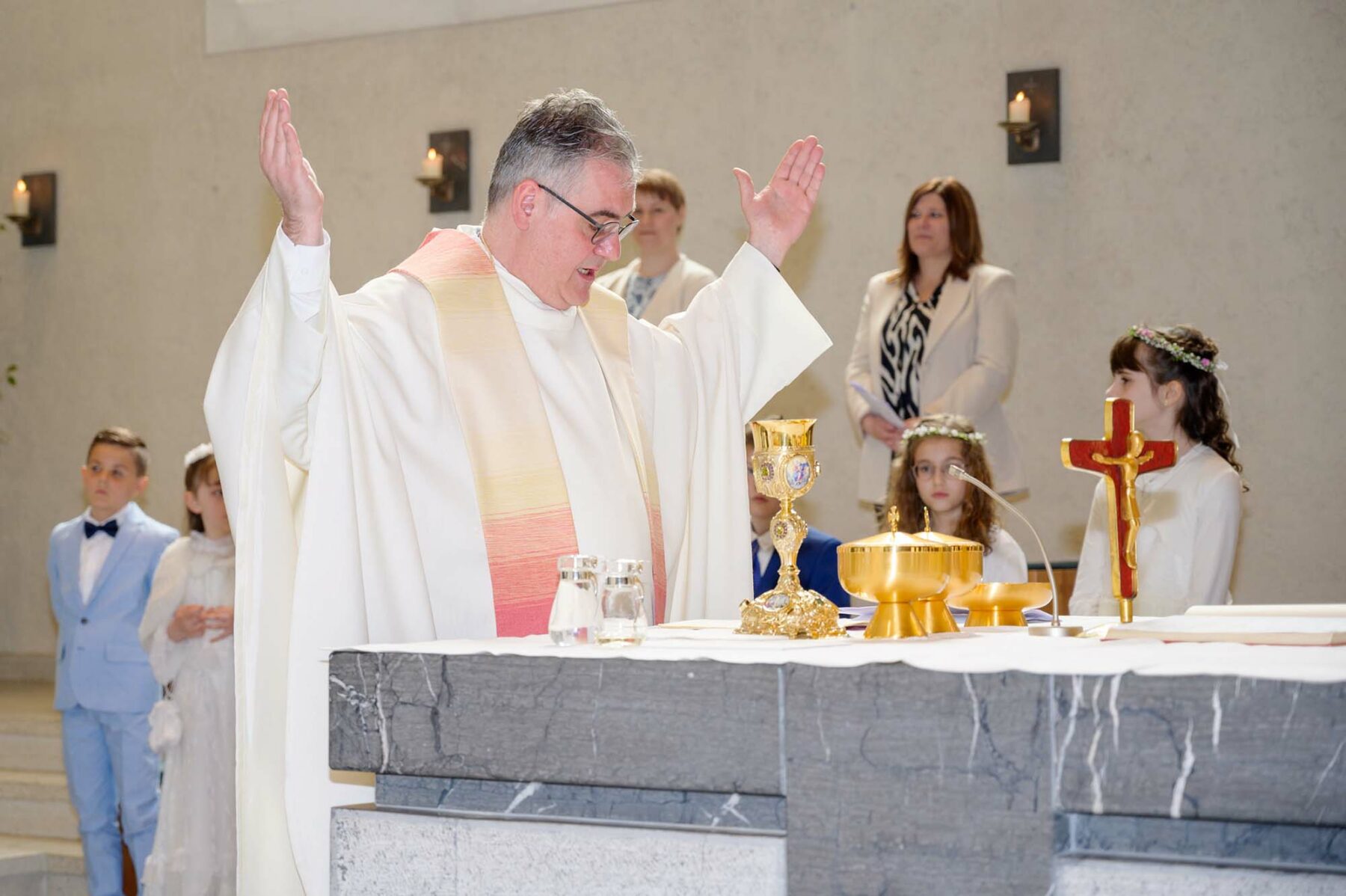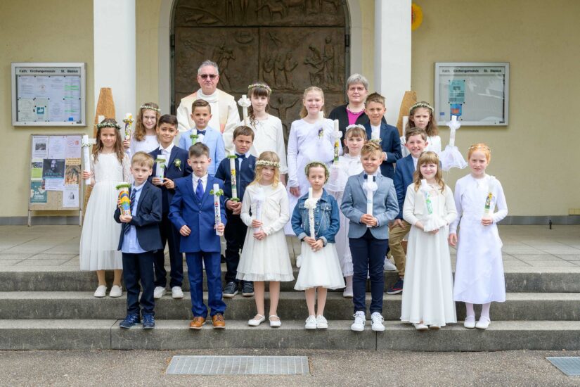 In diesem Jahr gab es keine Pandemie bedingten Einschränkungen, wie in den letzten beiden Jahren, so dass alle Kinder gemeinsam die Erstkommunion feiern konnten. Sie wurden um 10:00 Uhr aus der Arche Noah von Pfarrer Bonaventura Gerner mit drei Ministranten abgeholt und unter Begleitung des Vorbereitungsteams in die Kirche geleitet. Das Blasorchester Biberach umrahmte musikalisch den feierlichen Einzug.