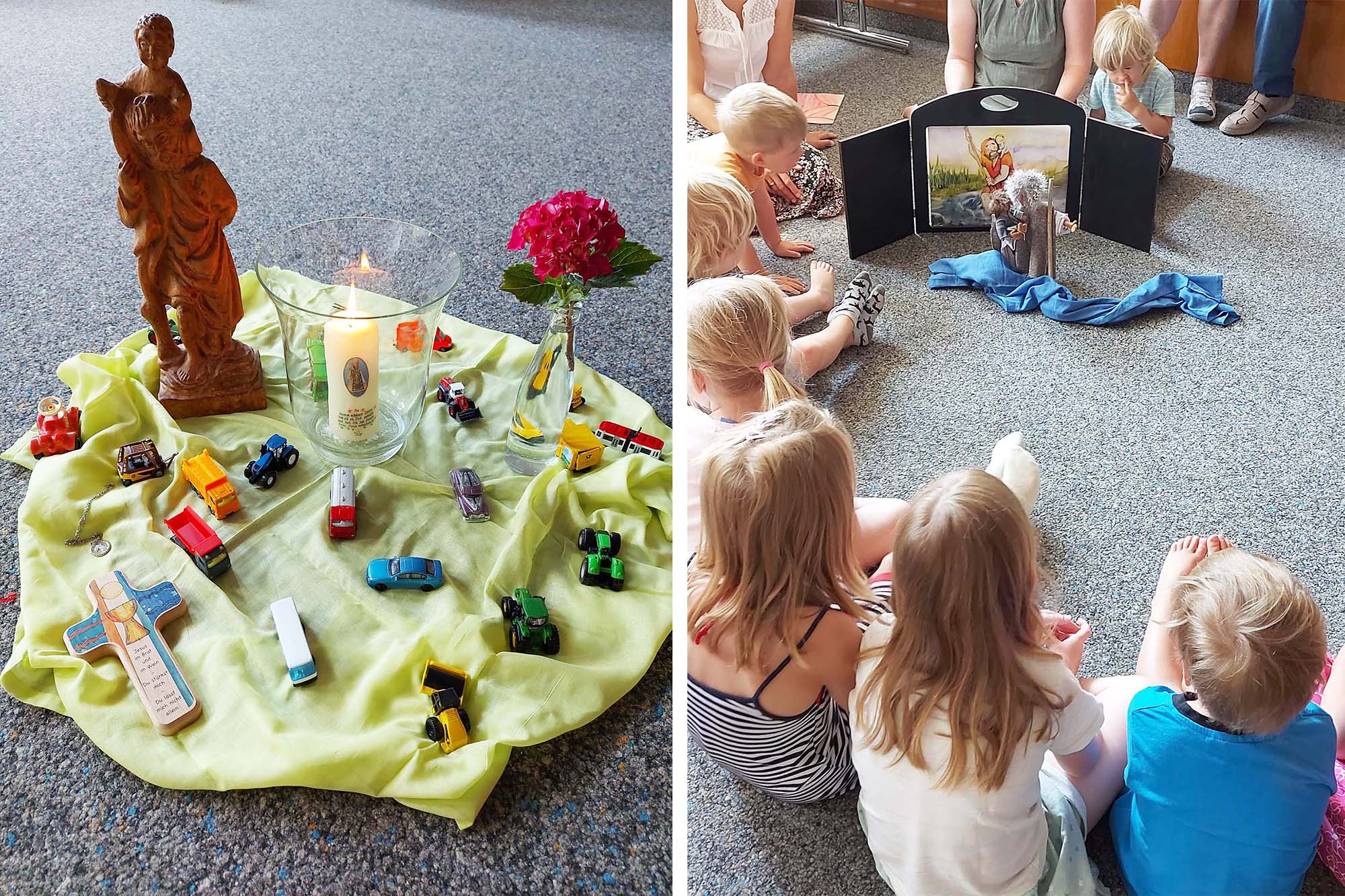 Die Kinder blickten zu Beginn in ein Schmuckkästchen und entdeckten dort eine Kette mit Christophorus-Anhänger. Anschließend wurde das Tuch über einer Holzstatue gelüftet und zum Vorschein kam Christophorus mit Stab und dem Jesuskind auf den Schultern. Sehr eindrücklich verfolgten Groß und Klein bei der Erzählung mit Figuren, wie Christophorus zu seinem Namen kam, wie er durch den Fluss watete und er, der große, kräftige Mensch, das Gefühl hatte, das kleine Kind sei so schwer wie die ganze Last der Welt. Tatsächlich offenbarte sich das Kind als Kind Gottes. Als Beweis durfte Christophorus seinen Stab in die Erde stecken und am nächsten Morgen war er angewachsen und Blüten zierten ihn. Gottes Geist hatte ihn lebendig gemacht. So sagt es die Erzählung. Eine feierliche Note bekam das gemeinsam gesungene Segenslied „Möge die Straße uns zusammenführen“ durch die Begleitung mit Flöte und Geige. Im Vertrauen darauf, dass auch Christophorus die Kinder beschützen möge, wenn sie unterwegs sind mit ihren Fahrzeugen oder mit ihren Familien auf Urlaubsreisen mit dem Auto, Schiff oder Flugzeug, gingen alle gemeinsam zu den „Kinderparkplätzen“ bei der Chorsaalwiese. Zum Schluss erhielten die begleitenden Eltern und Großeltern einen Segensspruch, um damit selbst das Fahrzeug ihres (Enkel-)Kindes zu segnen. Die Kinder bespritzten ihr Fahrzeug mit Weihwasser. Zur Erinnerung gab es für jedes Kind einen Christophorus-Aufkleber aufs Lenkrad oder den Lenker. Dann ließen es sich die Kinder nicht nehmen, miteinander ein paar Runden auf ihren Fahrzeugen zu drehen.